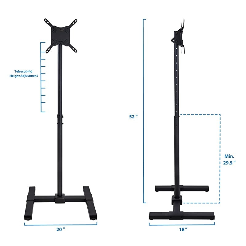*****ADJUSTABLE HEIGHT: For when you need to find the perfect height and viewing angle in your home, during a tradeshow, or outdoors, this adjustable steel monitor stand can reach up to 52 inches in height using the built-in telescopic pin lock feature, and can tilt 30 degrees downward from the TV bracket.