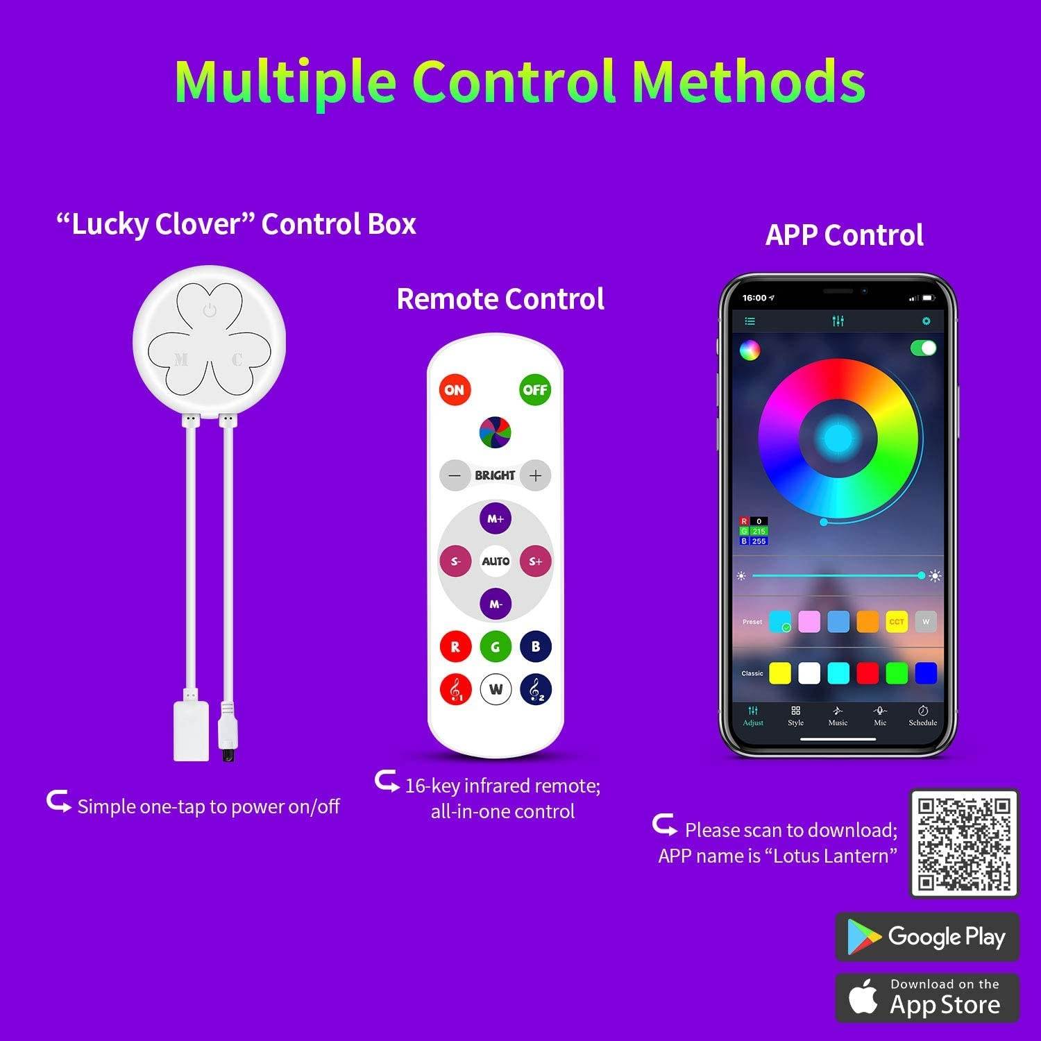 3 Ways to Control: ??Download the "Lotus Lantern" App and turn on the Bluetooth of the phone to connect tv lights, you can control tv backlight to choose your favorite color and brightness. ??Comes with an IR remote control so you can adjust the tv lights more easily. ??The u201cLucky Cloveru201d control box enables you to turn on/off the tv light strip, change color modes and Mic modes. ??Sync with Music??Tv backlight Bluetooth with highly sensitive microphone, spectrum with light and colors adjusting automatically base on the ambient sound. The light strips will sync bias lighting to your favorite song and shows how color changing with the rhythm. Create romantic, festive atmosphere for events like Halloween Christmas Valentine or party. ??16 Millions+29 Dynamic Mode+Timer??Via "Lotus Lantern" App, you could freely choose 16 millions vivid colors and 29 dynamic modes such as flash, rotate, fades depending on mood to suitable for various occasions. You can adjust the light brightness from 1% to 100%. Customize your own lighting, build your own movie theater. Set a timer for your USB tv lights, schedule automatically switches on/off via APP, making you wake up in romantic lighting every morning.