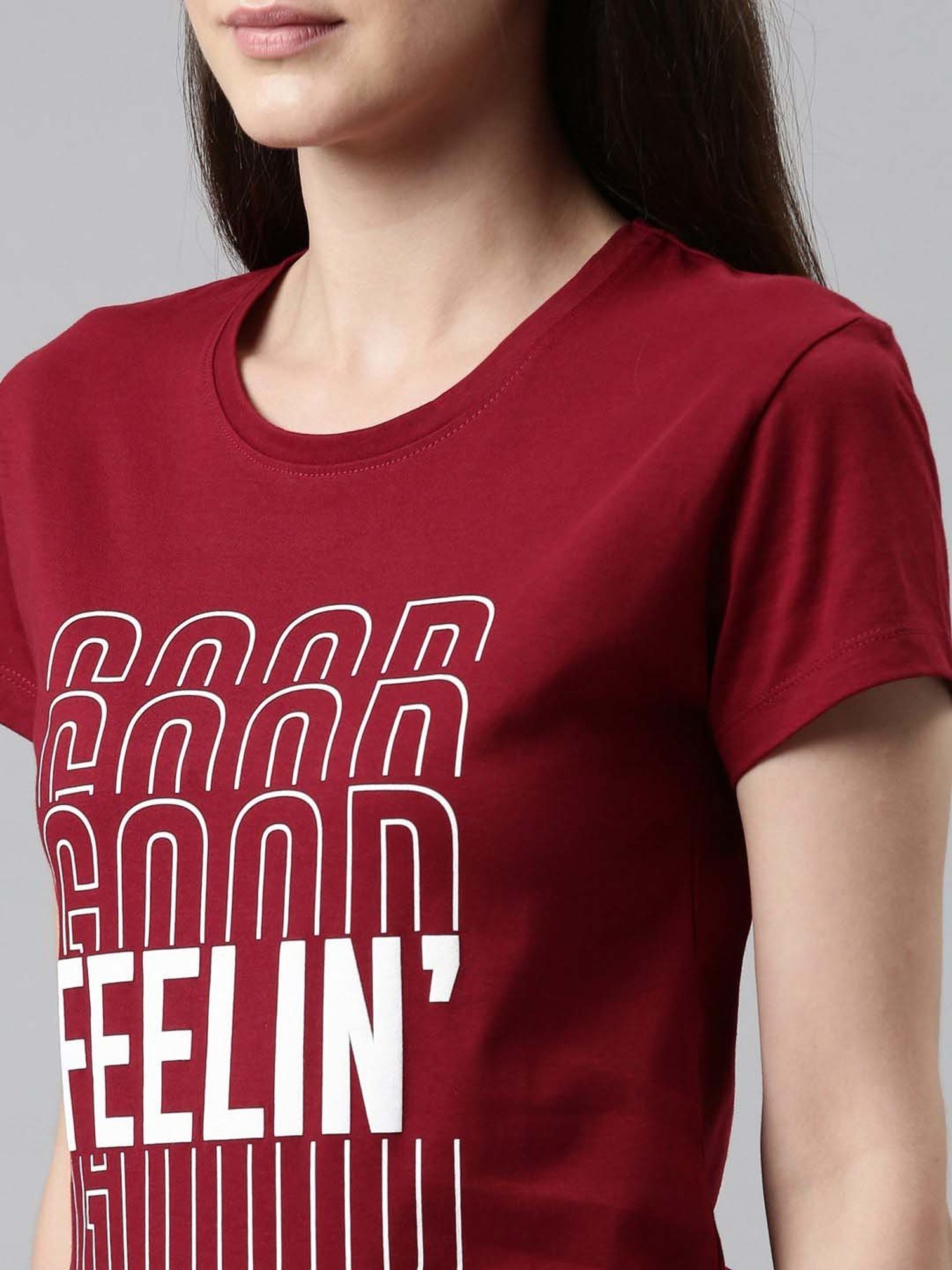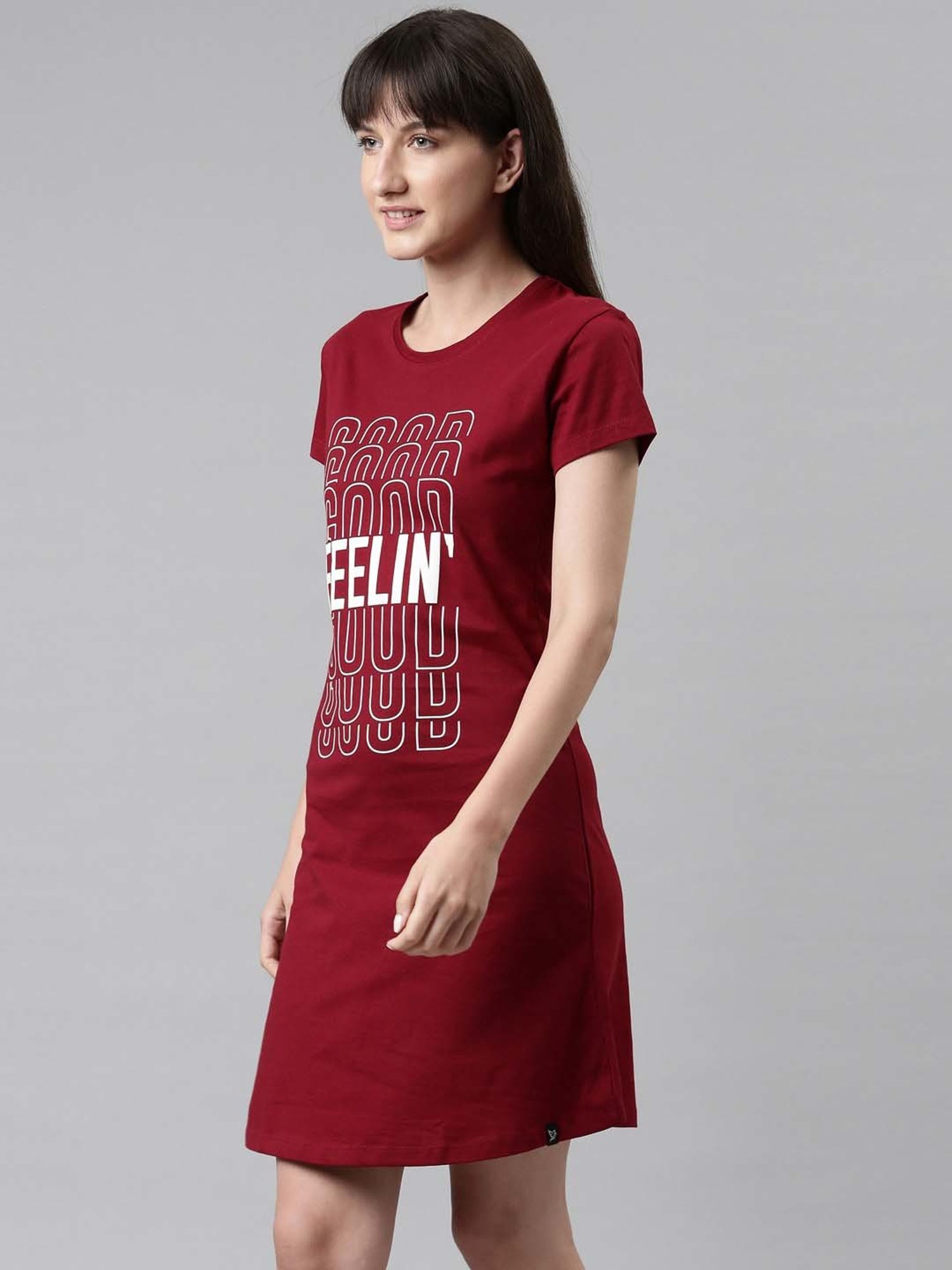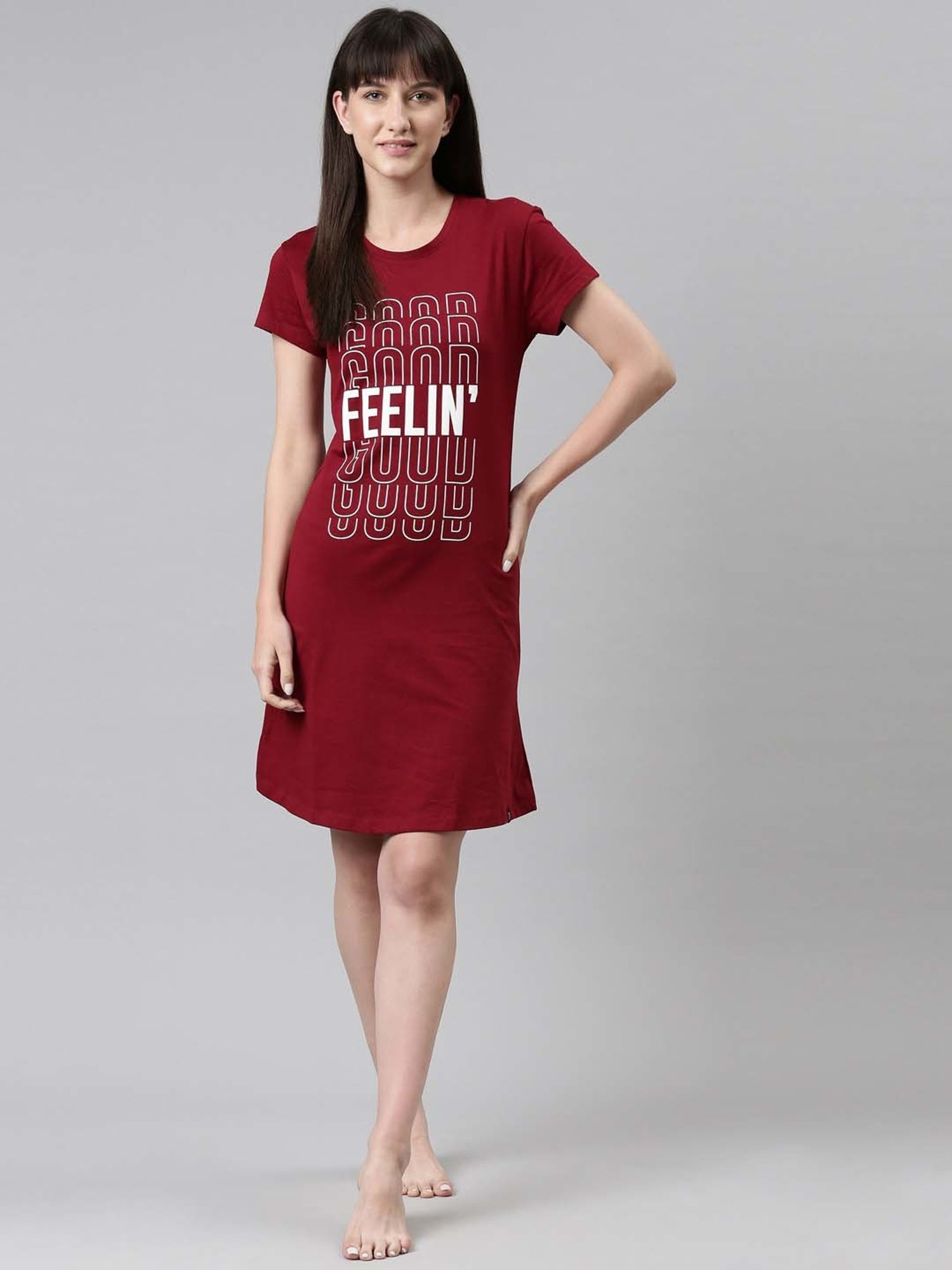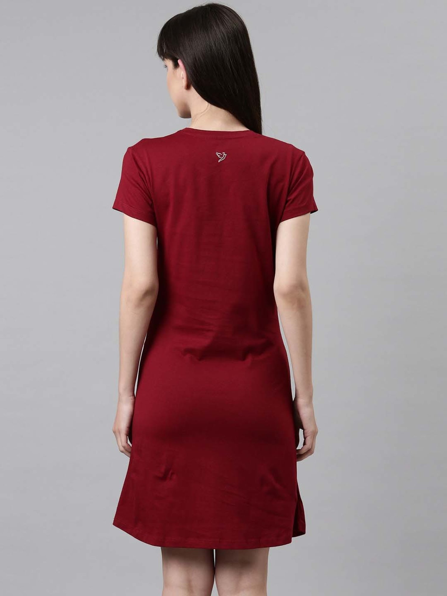 Give your sleepwear wardrobe an overhaul with this maroon sleep tee from TWIN BIRDS. Tailored to sartorial perfection from premium quality fabric, it assures a soft and soothing touch against the skin. The round neck adds to its appeal. The printed pattern makes it a captivating choice.