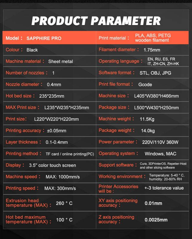 Each machine is equipped with a 0.4mm mk8 nozzle, a spare nozzle and many gifts, including commonly used tool kits, installation kits and 0.2kg filament.
