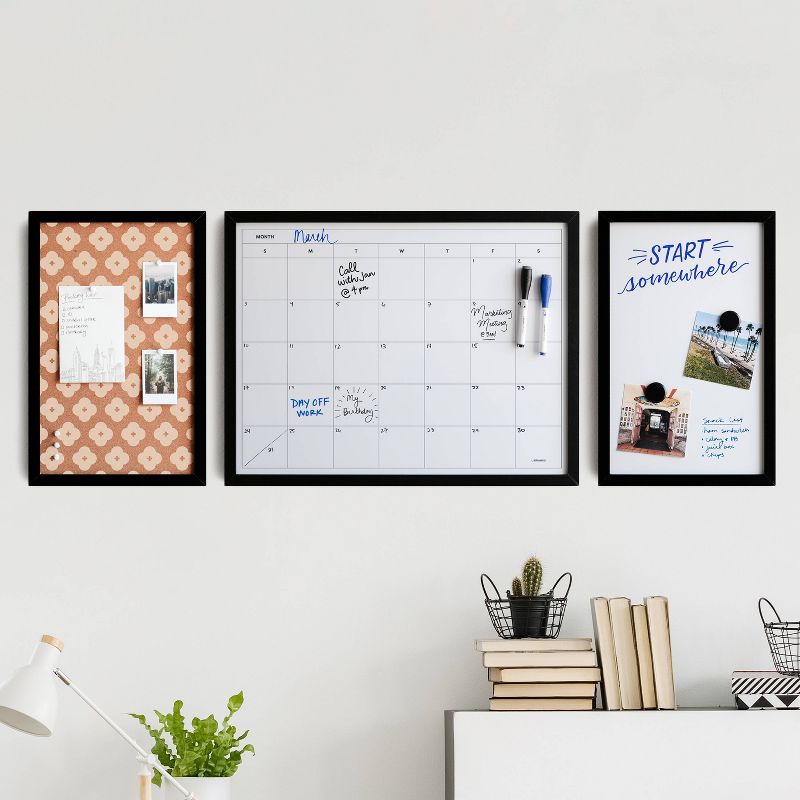 •(1) 17" x 22" black wood frame dry erase calendar, (1) 11" x 17" black wood frame printed cork bulletin board & (1) 11" x 17" black wood frame dry erase board