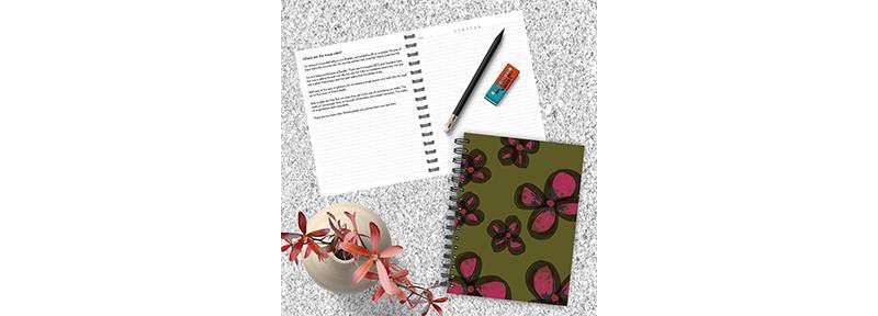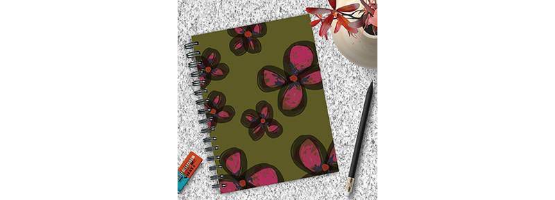 Bright, pink painted flowers, outlined in black accent the khaki green cover to inspire your thoughts and creativity in this spiral journal! Perfectly sized for a handbag, backpack or briefcase this 7" (w) x 9" (h) lined, wire-o journal will be right there with you when inspiration strikes! The fashionable front and back covers are made to last with a textured, durable material. This journal has 142 lined pages, each with a dedicated spot for the day of the week, is wire-o bound to lay flat and is sure to help you keep track of daily notes, thoughts and inspiration!