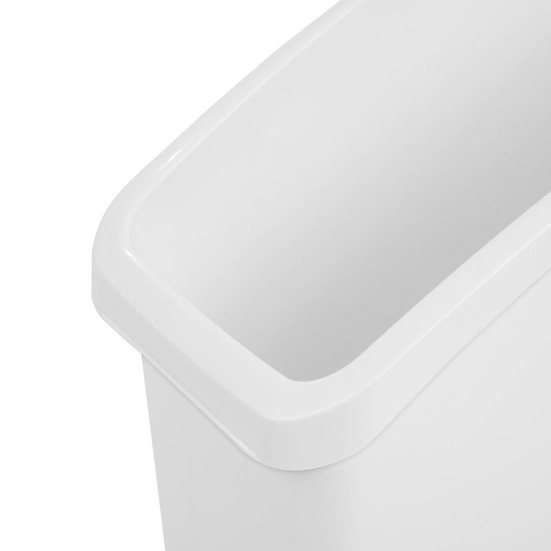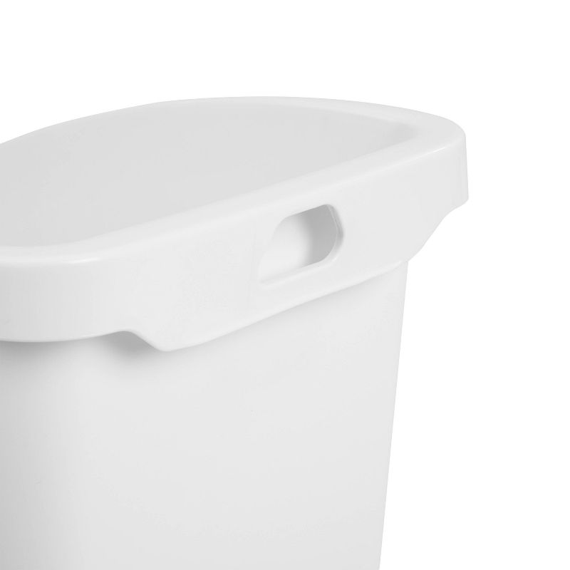 The Under Sink Wastebasket is the ideal solution for households looking to save some space in the kitchen and keep trash hidden and out of sight! The slim, compact design fits perfectly inside cabinets while the large, angled opening allows for effortless disposal. Located on the back of the wastebasket is a bag-holding feature that keeps the trash bag from sliding out of place. Simply push the edge of the bag through the hole to secure it in place. In addition to the kitchen, this wastebasket is perfect for use in the bathroom, home office, garage, and is a great solution to collect and sort recyclables. A reinforced rim on the front and back allows for comfortable lifting and carrying, while the durable design will hold up to regular day-to-day use. This wastebasket accommodates a standard 8-gallon trash liner and offers an easy-to-clean textured surface. The overall assembled dimensions of this item are 15 3/4" L x 8" W x 18" H.