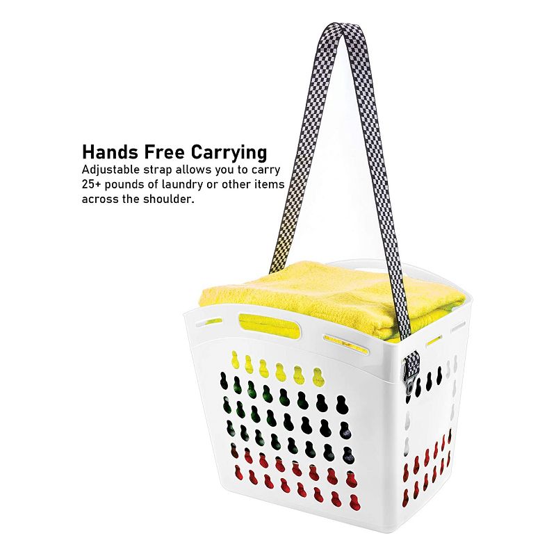 These hands-free laundry baskets are the perfect place to collect your dirty clothes, towels, floor mats, and more. A stackable design makes it easy to move multiple baskets at once. There's even room to add labels and make sure everyone in the household's laundry stays separate and organized. Made from lightweight and flexible plastic, the frames are built to last. Comfortable handles give you a convenient 1- or 2-handed carrying while the included shoulder straps let you keep your hands free for other things. Each of the vents serves as a keyhole lock for the shoulder strap, letting you find the most comfortable carrying option for you.