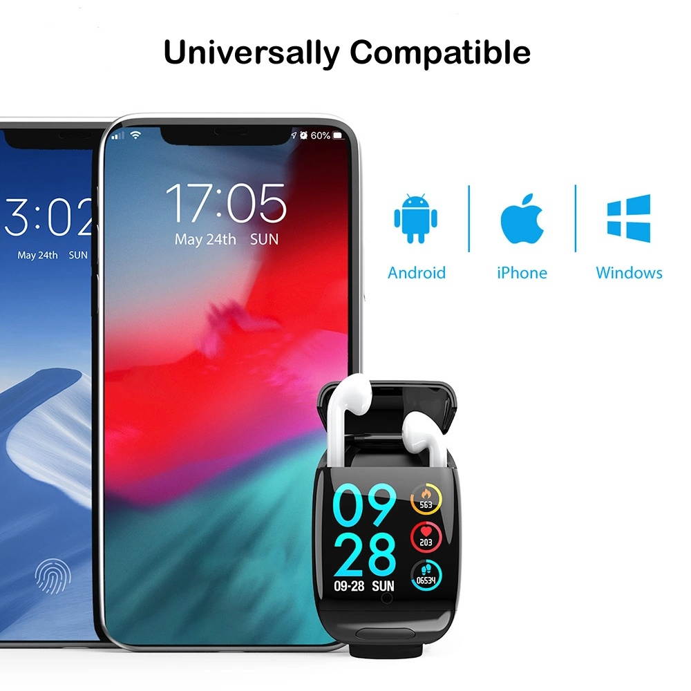 The M8 is a 1.3 -inch Smartwatch with Sleek Wireless EarBuds that are designed to be universally compatible with iOS and Android Systems. It can be used with any device that utilizes a bluetooth connection. The smartwatch easily pairs with either operating system and allows you to receive and answer calls / texts directly from the smartwatch. The Earbuds easily pair and sync up when playing music or watching your favorite show. The Smartwatch doubles as a charging case for your earbuds to ensure they're always topped off with a full charge. The battery is extremely efficient and provides up to 4-5 hours of talk/listening and up to 150 hours of standby time.