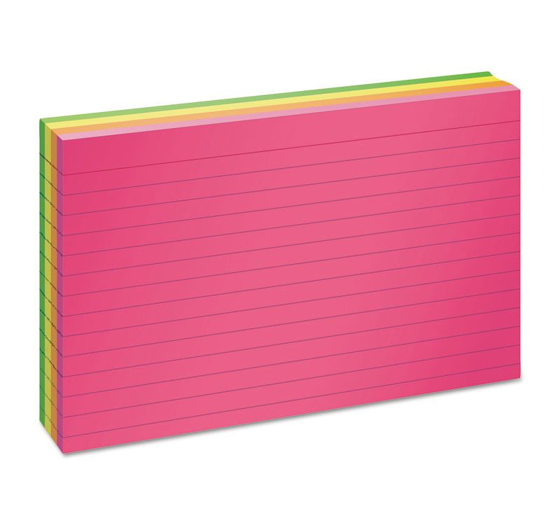 Neon glow colors draw attention. Great for uses that require high visibility, such as announcements, signs, flash cards, school projects, and more. Sturdy card stock for everyday use. Precision engineering to ensure uniform size. Ruled on one side and blank on the other for a variety of uses. Ruling: Ruled; Card Size: 4 x 6; Color(s): Assorted; Card Quantity: 100. Glow bright colors get noticed. Ruled for easy notetaking Sold as 100/Pack.