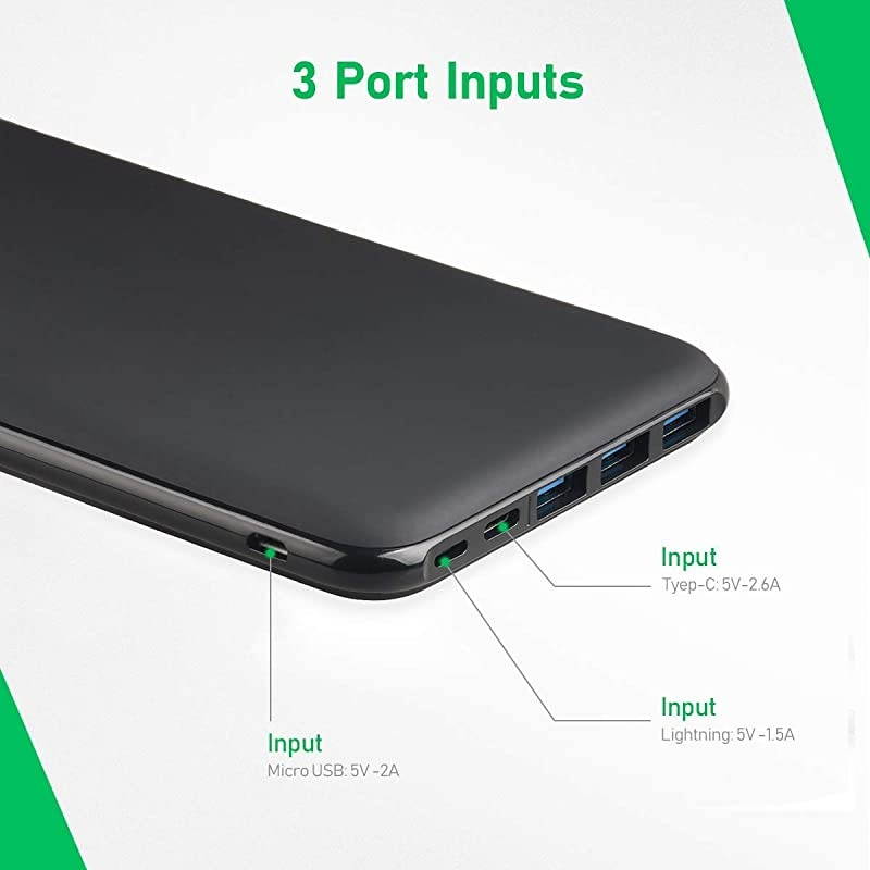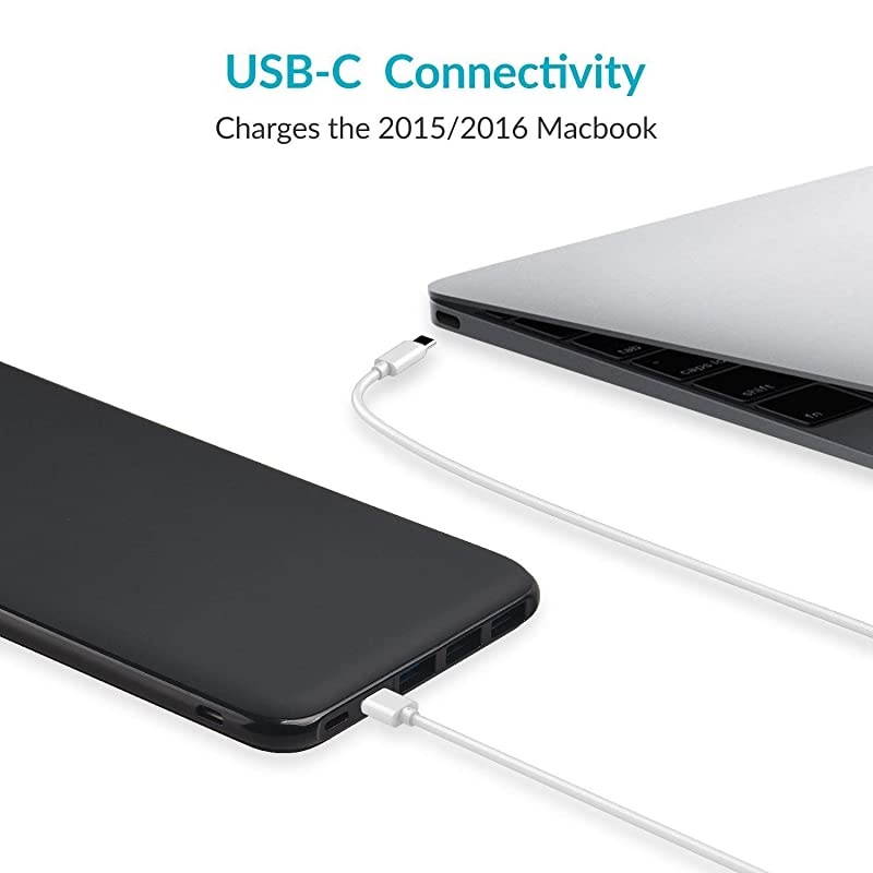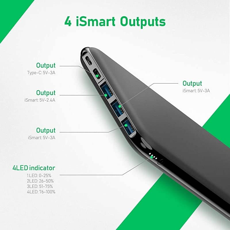 Portable Charger: 4 SmartE identification USB outputs (1 3A USB C + 3 USB A) can automatically detect and adjust the charging current to obtain the fastest charging, provide a powerful total current output of 5.4A to charge 4 devices (a USB-C device and three USB-A devices) simultaneously, the versatile and bidirectional USB-C port can supply a powerful 3A current by itself, also supports fast in and out*****Slim and Compact Battery Pack with 4