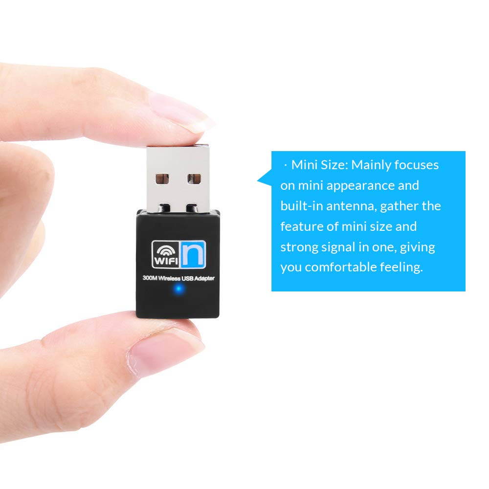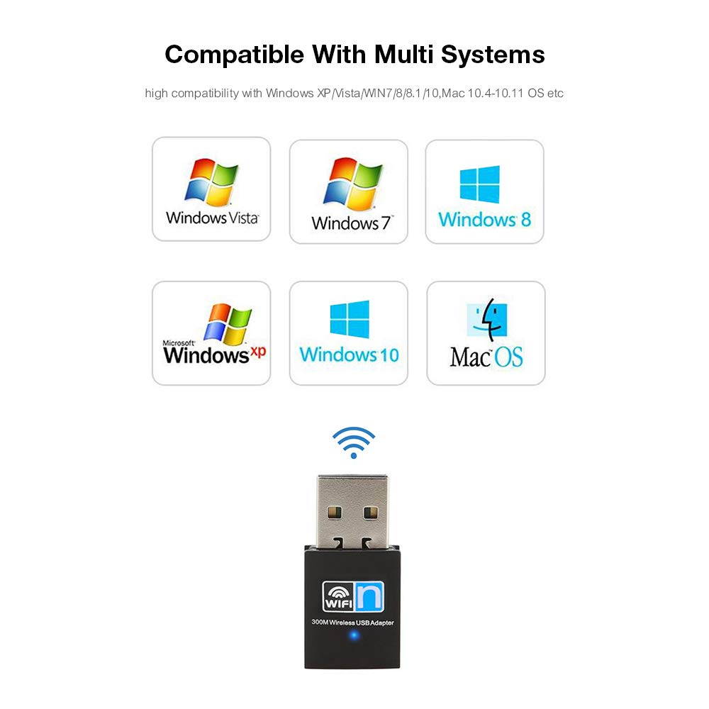 Feature: --Upgrades any computer to the latest 802.11 n standard --Max data rate up to 300 Mpbs with 802.11 n --Backward compatibility with 802.11 g 2.4GH z wireless networks --Low power consumption to extend the battery life of your laptop or portable device --Mini size design. space saving and easy to carry. --Heat dissipation holes, no fever and performs. --Easy to use, once you've installed the CD and run the software, you can simply insert the adapter to get connected. At windows 10, it’s Plug and plug --Supports state of the art standards-based security features: 64b/128bit WEP, WPA and WPA2 (TKIP+AES) to prevent unauthorized users to access your wireless network.