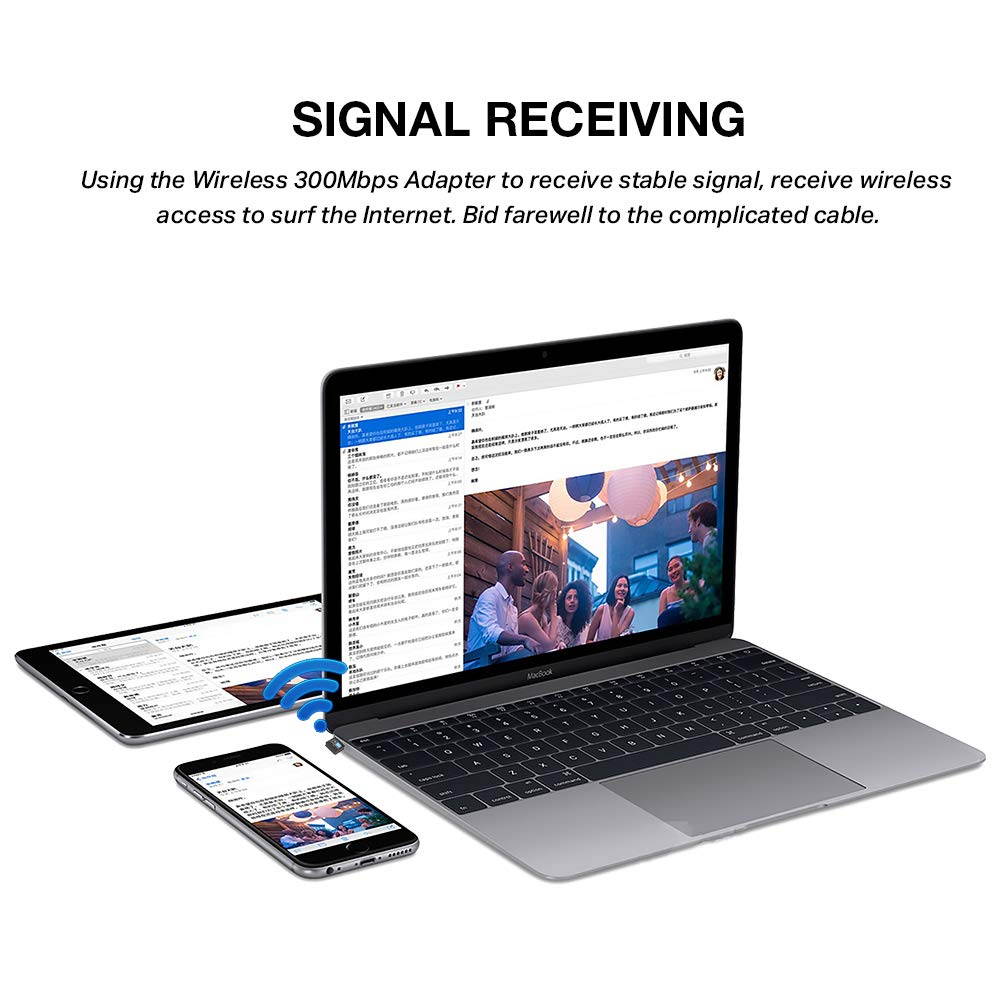 1.HIGH SPEED 2.4g WIFI signal: This usb wifi adapter's maximum speed up to 2.4GHz 300Mbps ,say goodbye to wifi dead zone. 2.HIGH GAIN LONG RANGE ANTENNA: It can help you connect even when signals are weak,The internal omni-directional antenna for increased coverage and stability, easy to carry and no space occupation with mini size. 3.WIDE COMPATIBILITY: Compatible with windows 10/8/7/Vista/XP/2000, Mac OS 10.4-10.12.1. 4.CUSTOMER SERVICE: We provide 18-Month Worry-free Warranty for this mini wifi adapter, Enjoy the convinience that our Wireless Network Card offers. |