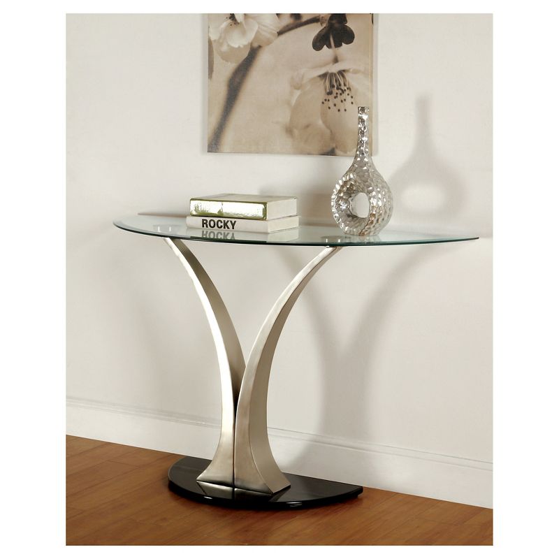 HOMES: Inside + Out Valeri Modern Flared Glass Top Satin Plated Sofa Table will make a stunning addition to your home. The 8mm clear tempered glass oval table top is supported upon a statuesque satin plated curved v-shaped metal post. This piece boasts a beautiful design with a contrasting bold colored solid base. The HOMES: Inside + Out Valeri Modern Flared Glass Top Satin Plated Sofa Table is complete with a sleek design, ideal for dressing up a bare wall.