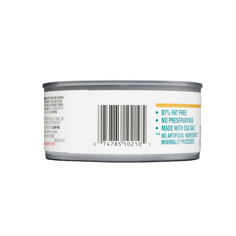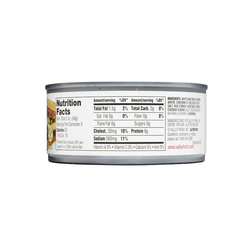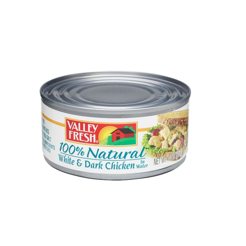 At VALLEY FRESH, we know it's important to feel good about what you eat. That's why our canned chicken starts with 100% natural ingredients: white and dark chicken meat, broth, rosemary, and sea salt. When it comes to canned chicken, simple ingredients and minimal processing mean great taste. Each serving contains 9 grams of protein, making it a good source of protein. Whether it's traditional chicken recipes, like your mother's favorite chicken salad, or something new, like chipotle chicken nacho bites, you're going to love the chicken you serve.