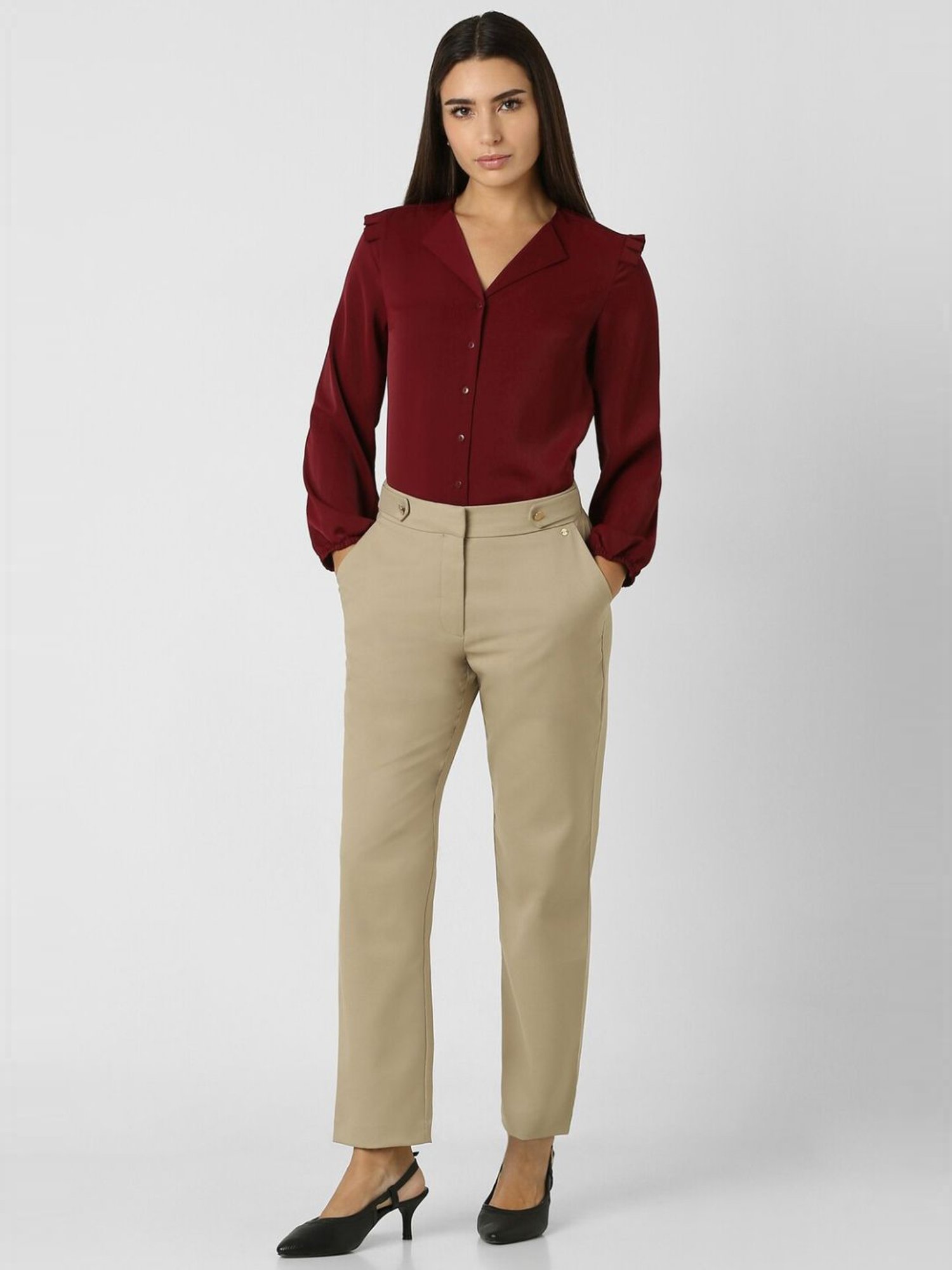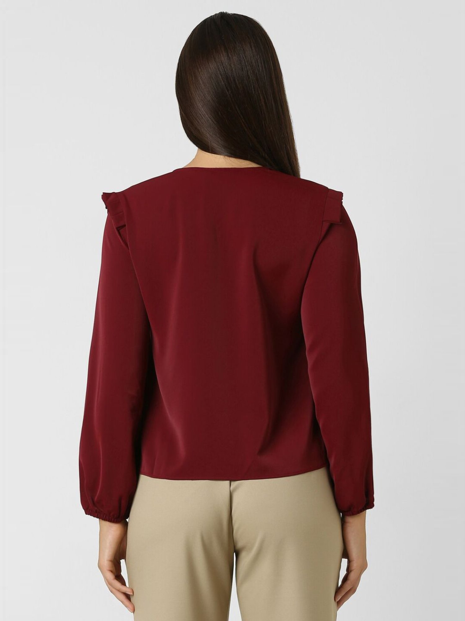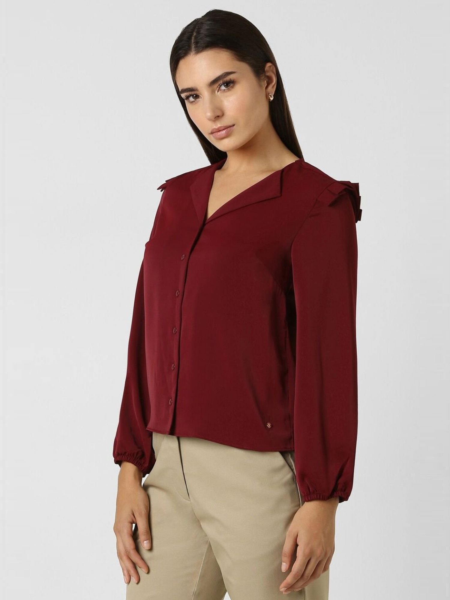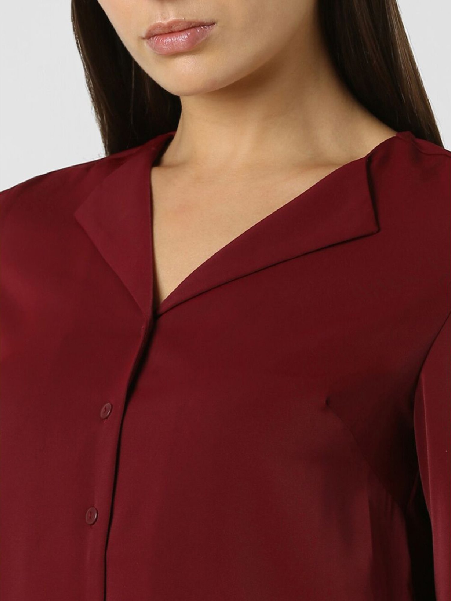Channel a winning style by wearing this maroon formal shirt from Van Heusen. Tailored to sartorial perfection from premium quality fabric, it assures a soft and soothing touch against the skin. The V-neckline adds to its appeal. Exuding full sleeves, it is sure to fetch you compliments from all.