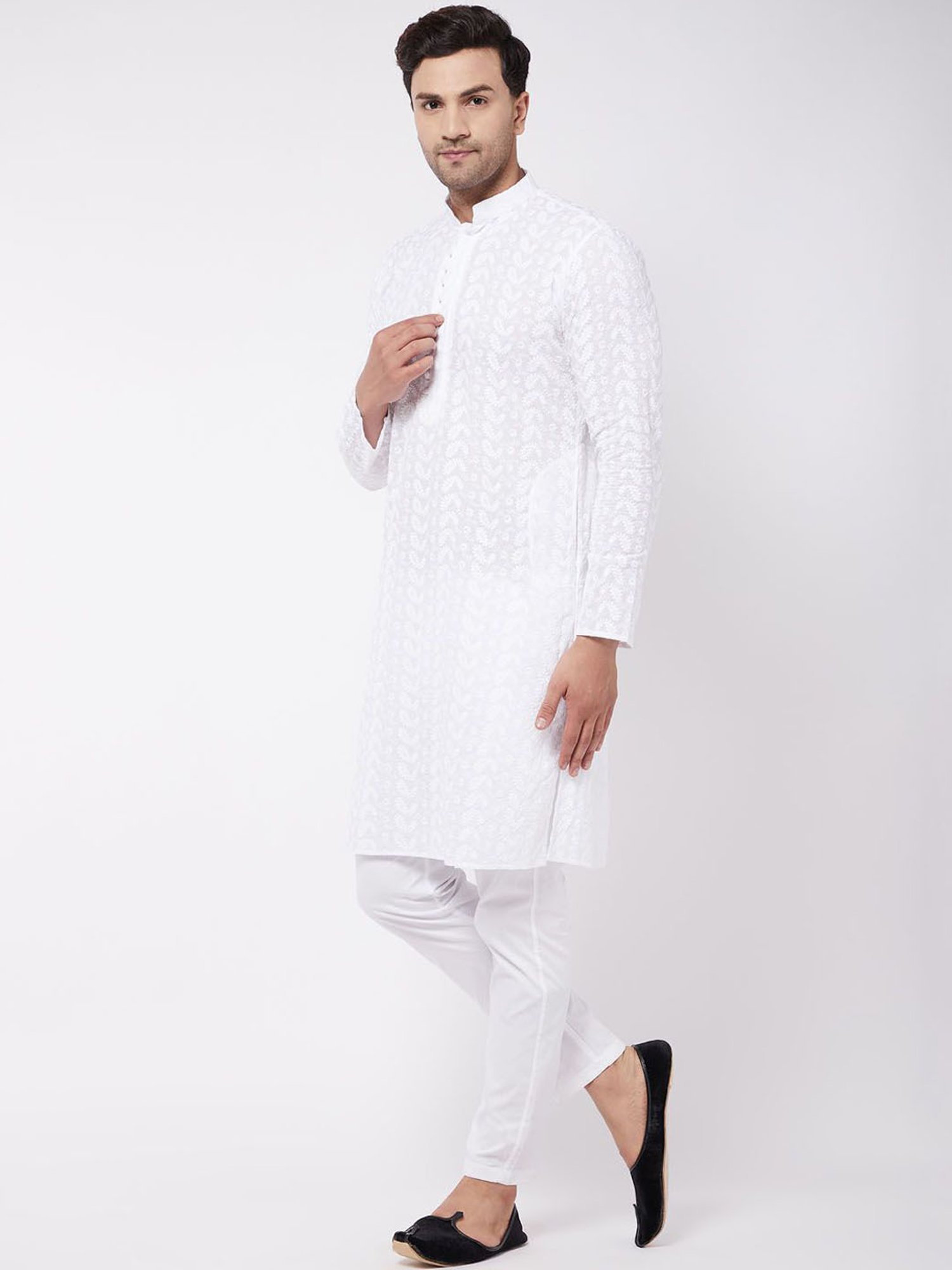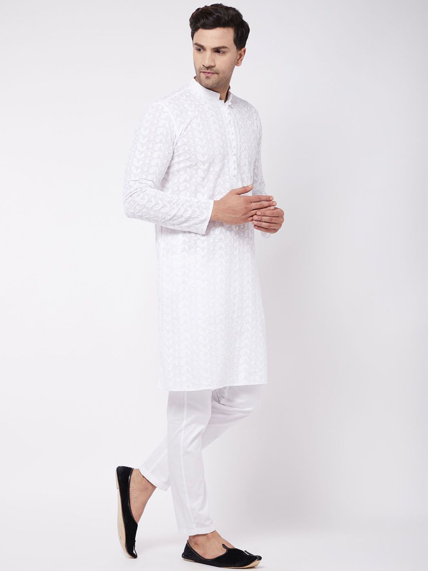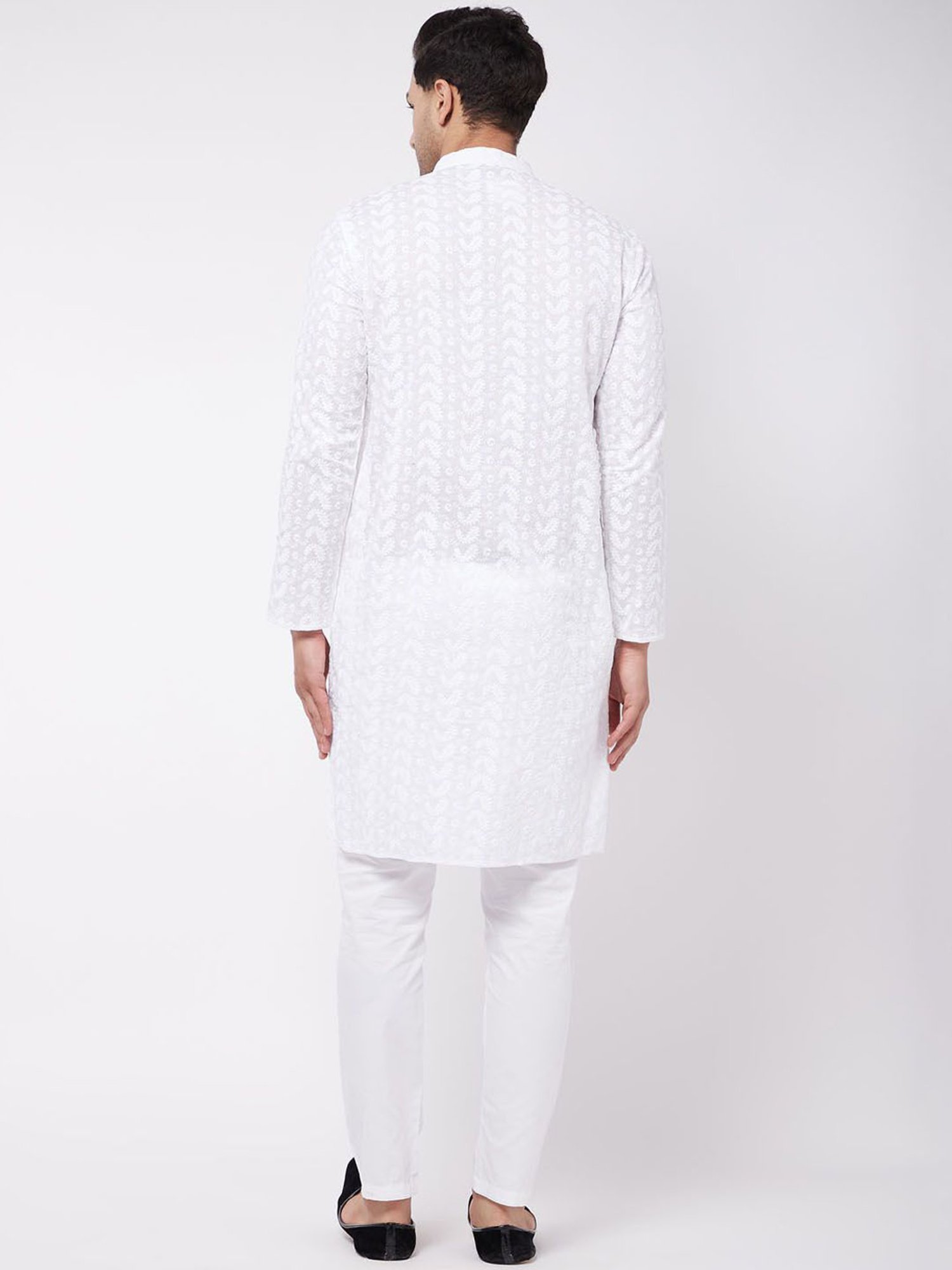Be in the spotlight by wearing this white straight fit ethnic suit from VASTRAMAY. Tailored to sartorial perfection from premium quality fabric, it assures a soft and soothing touch against the skin. The mandarin collar augments its design. Exuding full sleeves, it is sure to fetch you compliments from all. The paisley print makes it a bewitching choice.