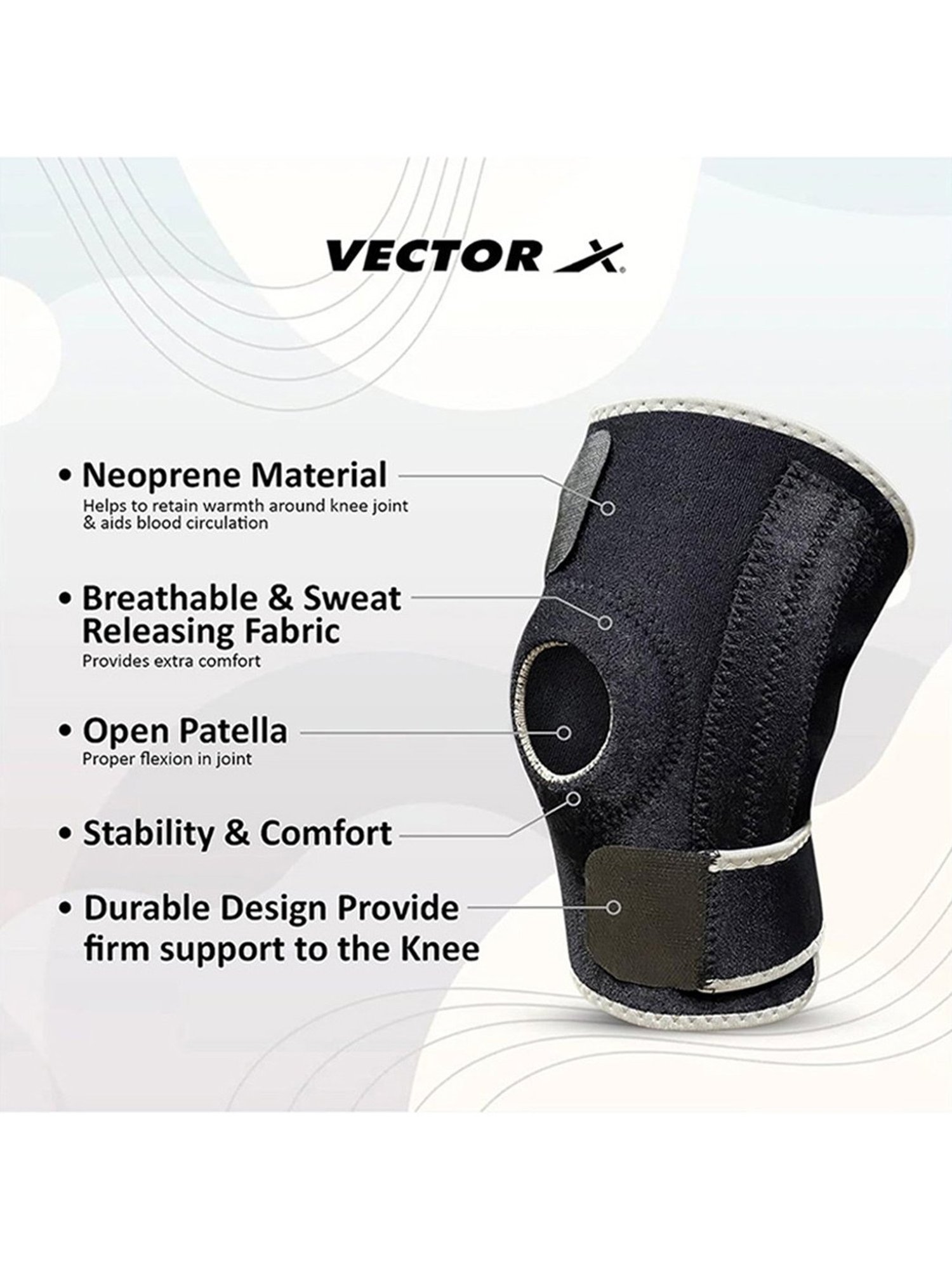 This black kneepad from Vector X is used to prevent pain due to muscle cramps and protect muscles. This free-size kneepad is made from high-quality neoprene for durability. Its anti-tourniquet strapping maintains body temperature, accelerates blood circulation and facilitates rehabilitation. Its anatomical design ensures perfect fit and comfort. It provides good support to the knee with natural flexion. Its silicon patellar padding compresses the patellar tendon, relieves patellar pressure and positions the patella. Its length is 12 cm, height is 3 cm and weighs 50 gm.