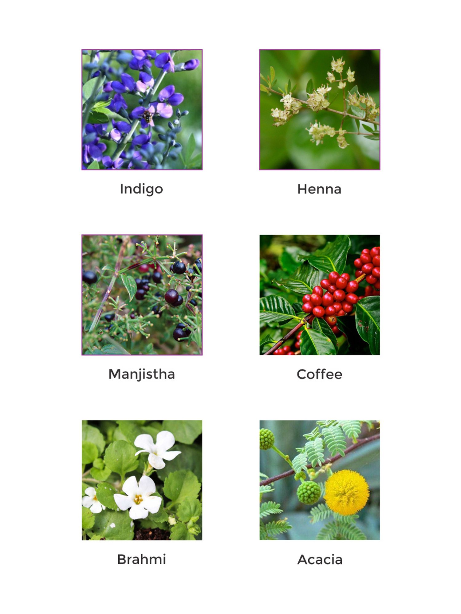 Composition: Indigoferra Tinctoria, Indigo, lawsonia Inermis, Henna, rubia Cardifolia, Manjistha, Coffee Arabica, Coffee, Bacopa Monniera, Brahmi, Acacia Catechu, Kattha, Emblica Officinalis, Amla, eclipta Prostrada, Bhangra.