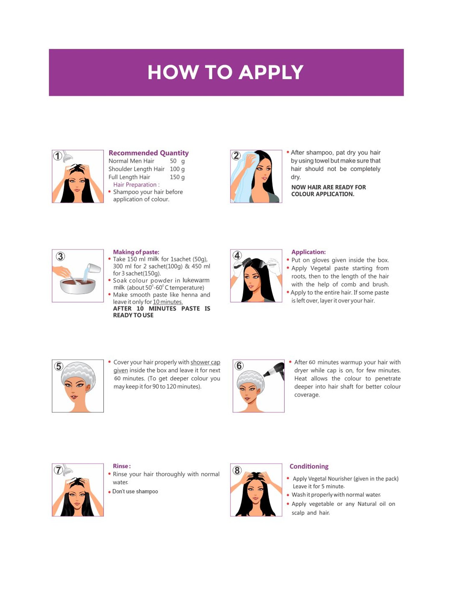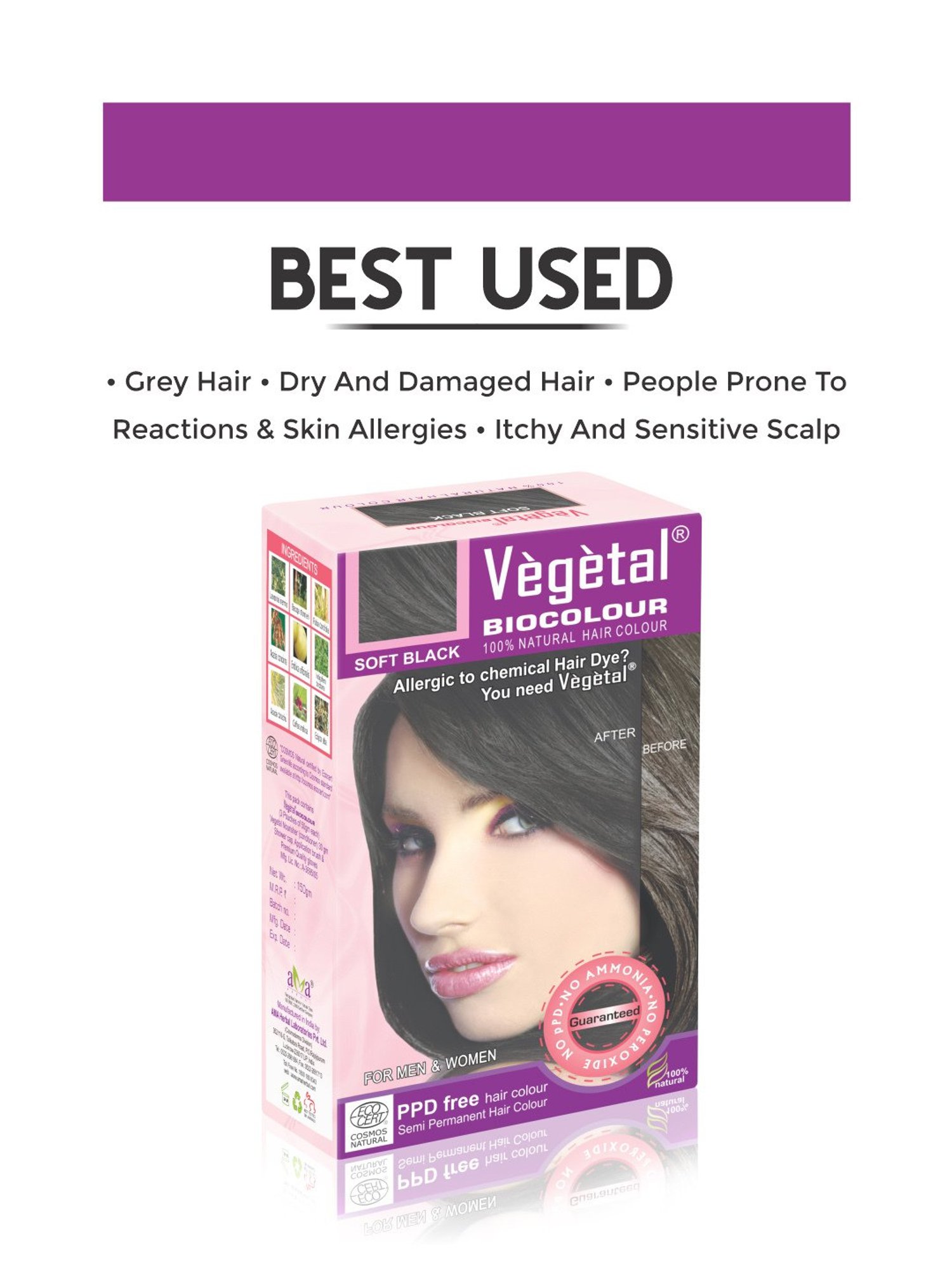 Vegetal Bio Colour No PPD No Ammonia No Hydrogen Peroxide Vegetal Bio Colour is 100 percent Natural Colour and provides up to 100 percent Coverage to Grey Hair. It controls Hair Fall, Dandruff and Damaged Hair. Contains Natural Botanical Extracts to provide overall protection to your hair. Colour Giving Components - 1 Indigoferra tinctoria, Indigo Colouring and Scalp Tightening 2 Lawsonia inermis, Henna Colouring, UV Protection, Conditioning 3 Rubia cordifolia, Manjistha Colouring 4 Coofea Arabica.
