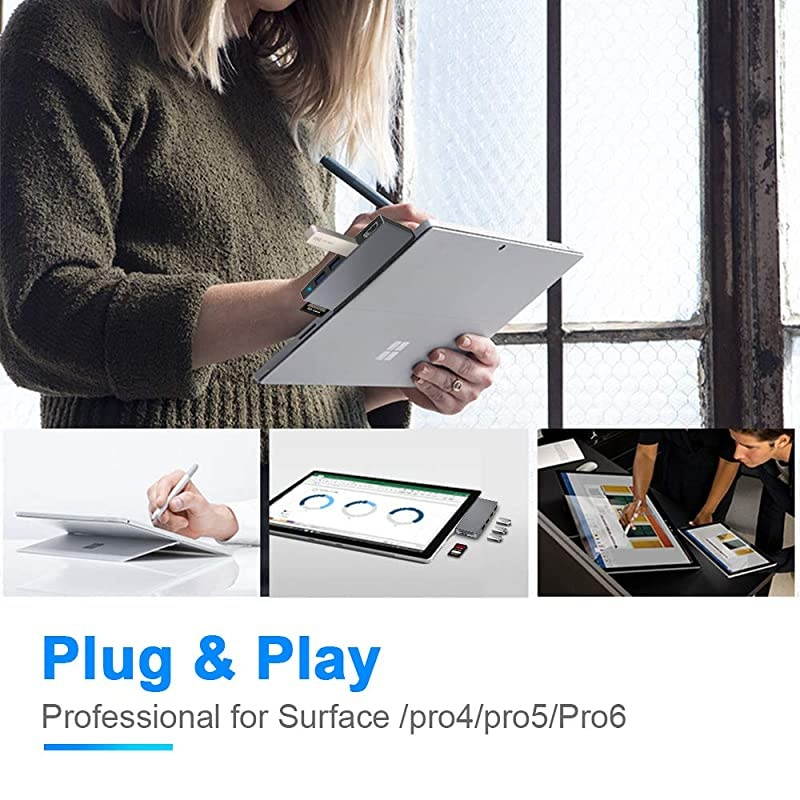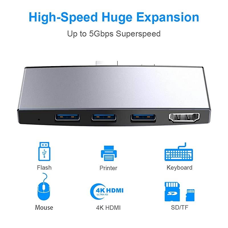 Surface Pro USB 3.0 hub combo adapter perfectly match with Surface Pro 4/Surface Pro 5/Surface Pro 6. USB 3.0 High Speed Transmission Surface Dock adapter with 3 USB 3.0 port, up to 5Gbps 10X fast than USB 2.0 hub. Transfer videos and images just in seconds, saving your time. 4K High Definition multiple hub adapter with 12.00 mm distance between USB to mini DP, provide a 4K/2K@30Hz high definition pictures or videos transfer for you through the 4K HDMI port.