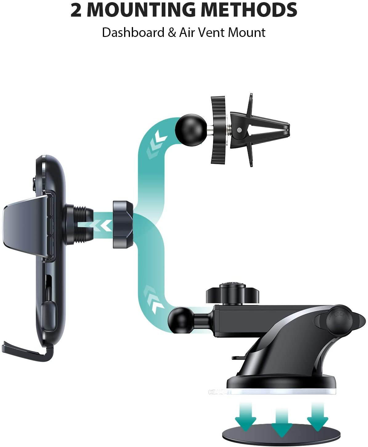 - Stable and Safe Car Phone Holder Mount: Super strong stickiness suction cup and 2-step lock mechanism provide extremely double strong suction power. This phone mount car can stay super securely in your car. The extra dashboard pad provides smooth surface. So the suction cup can stay more firmly and securely. The extremely flexible air vent clip fits for most of cars; the silicone on the clip helps this vent phone holder grip tightly on the air vent and protects the blades from scratching.