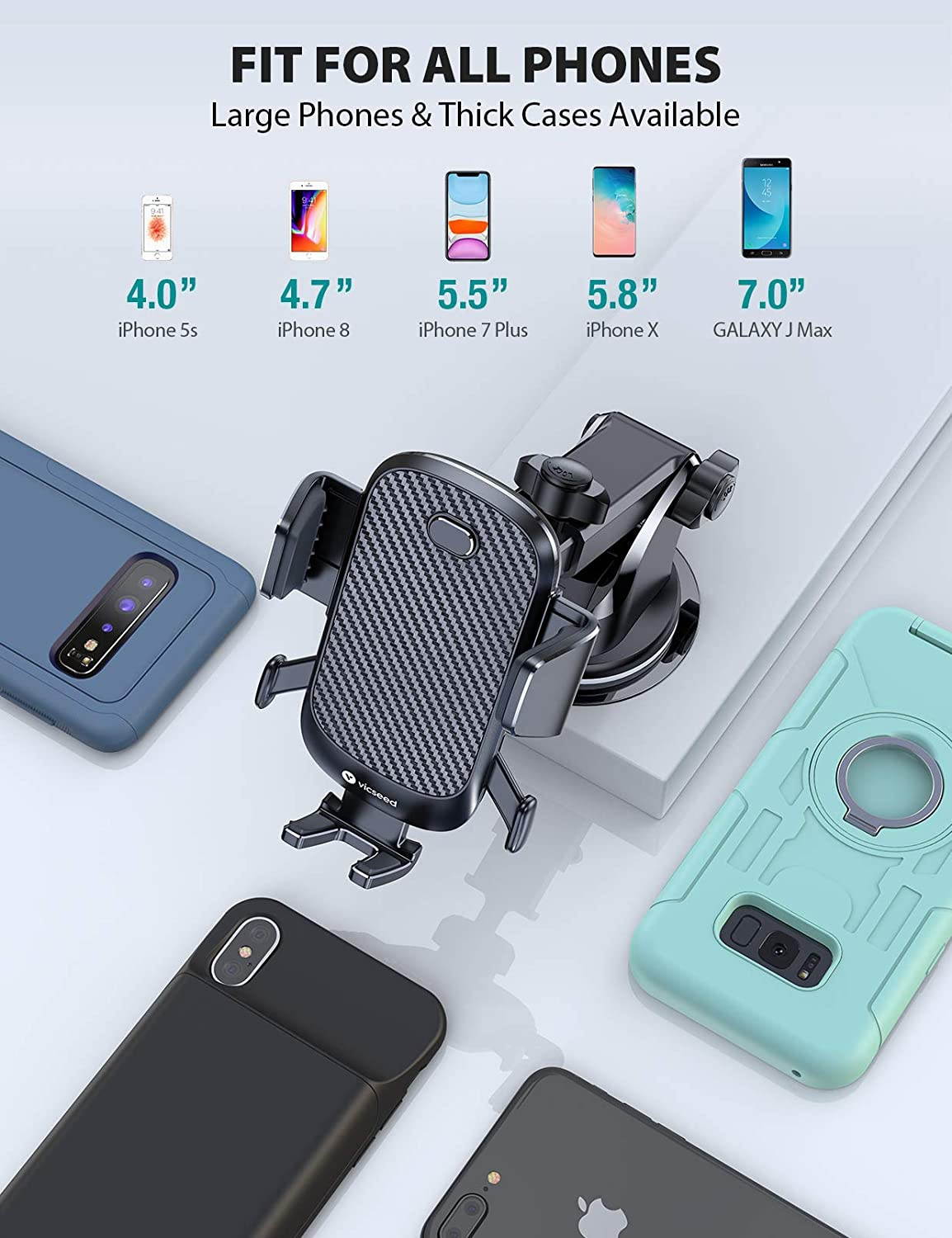 VICSEED one button lock cell phone car mount is with 0.8’’ super deep clamp so it can hold large phone with super thick case.