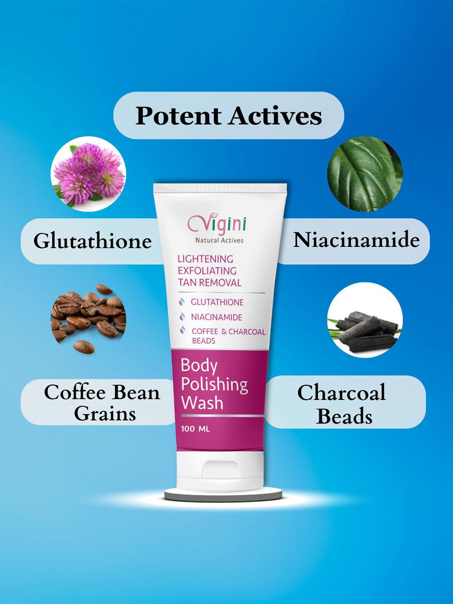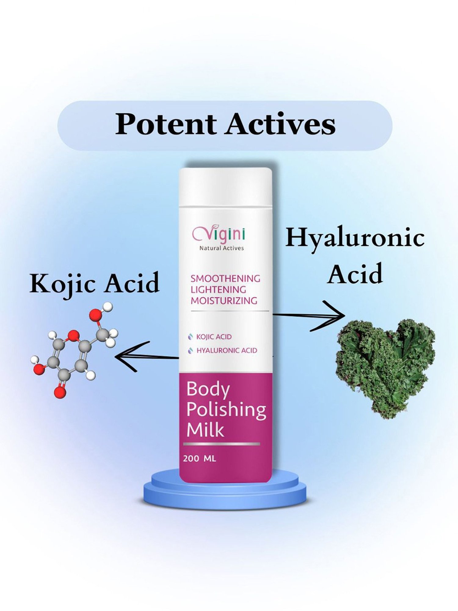Vigini 100% Natural Actives Body Polishing Milk is a type of skincare product that combines the exfoliating and moisturizing properties of milk and other beneficial ingredients. It is designed to provide gentle exfoliation, nourishment, and hydration to the skin, leaving it smooth, soft, and radiant. Vigini Lightening Brightening Body Polishing Wash works to brighten skin tone all over your body with minimal effort without use of a scrub or bleach. This combo contains Vigini Body Polishing Wash - 100 ml, Vigini Body Polishing Milk - 200 ml.