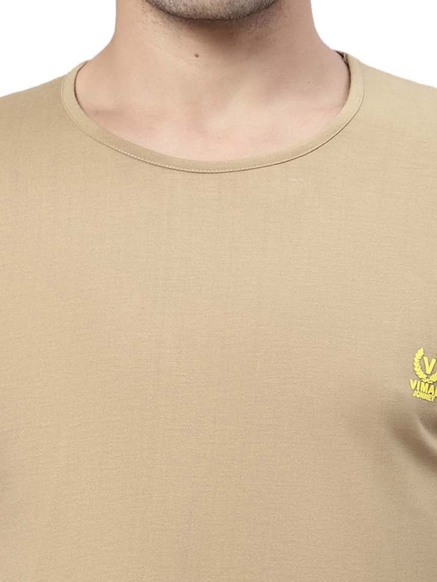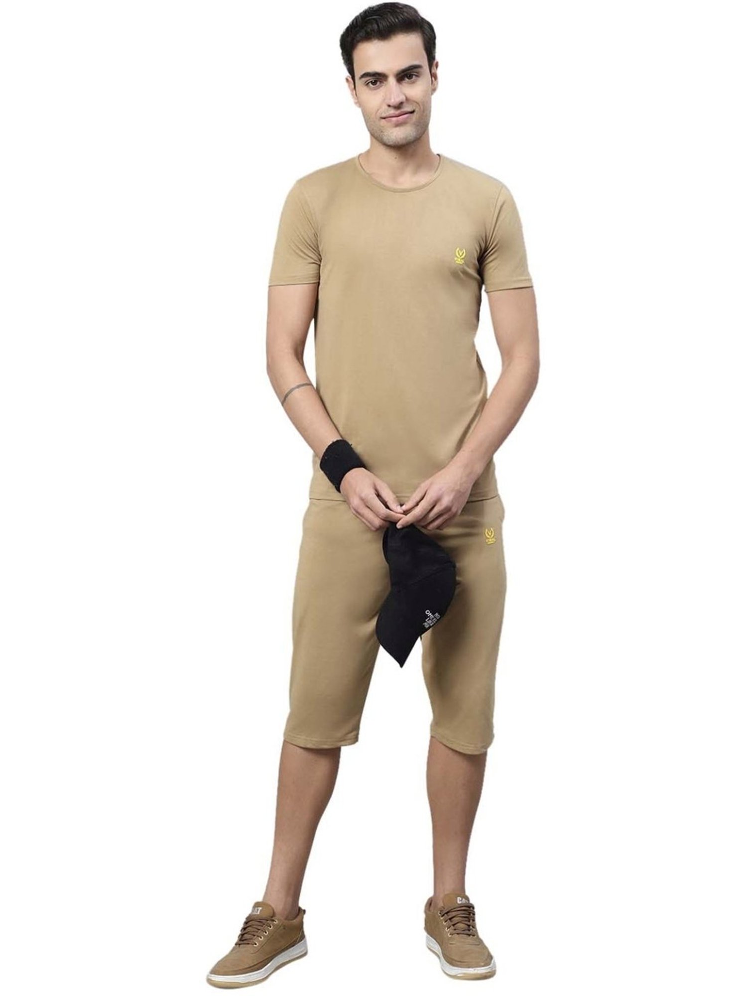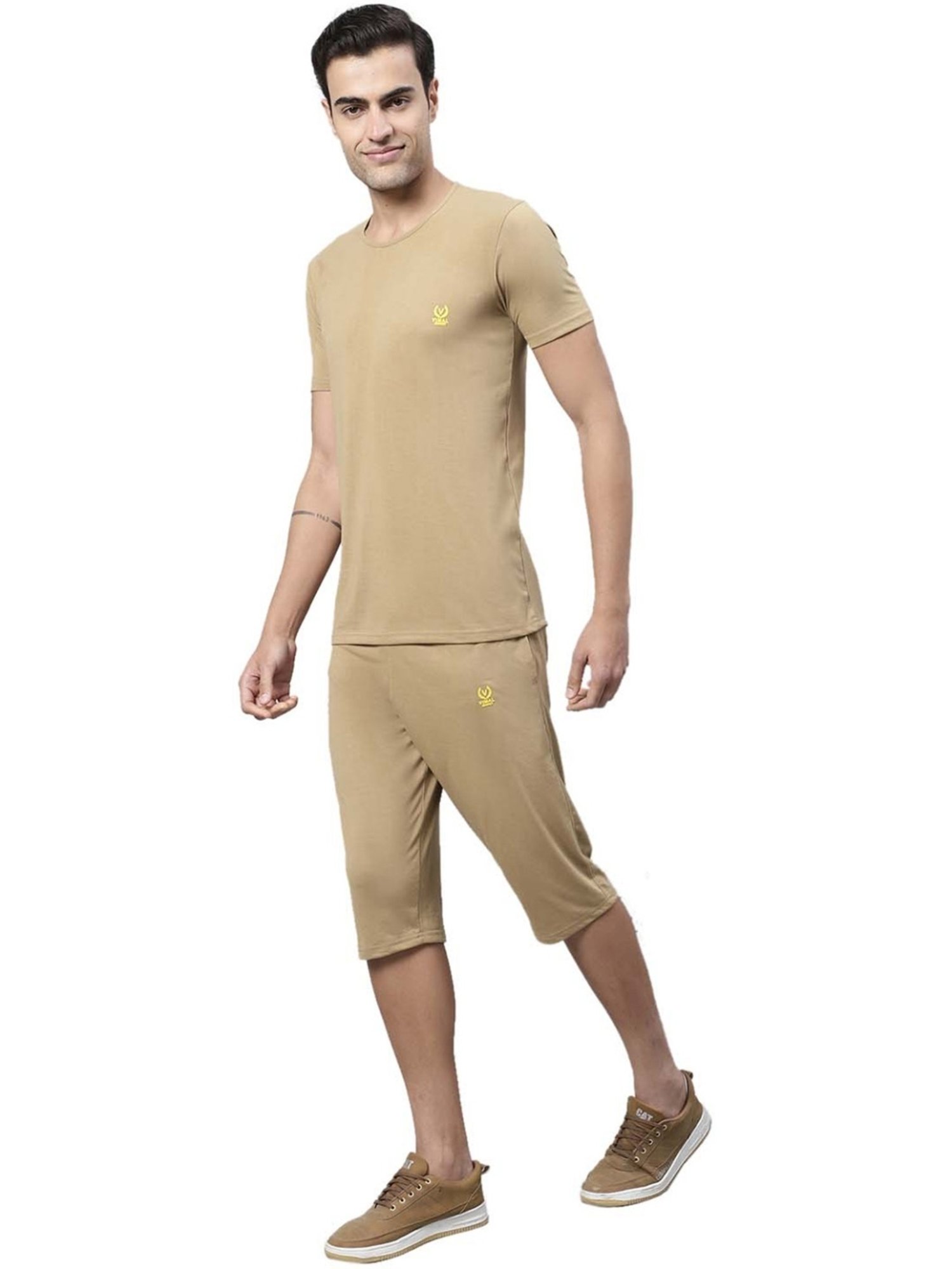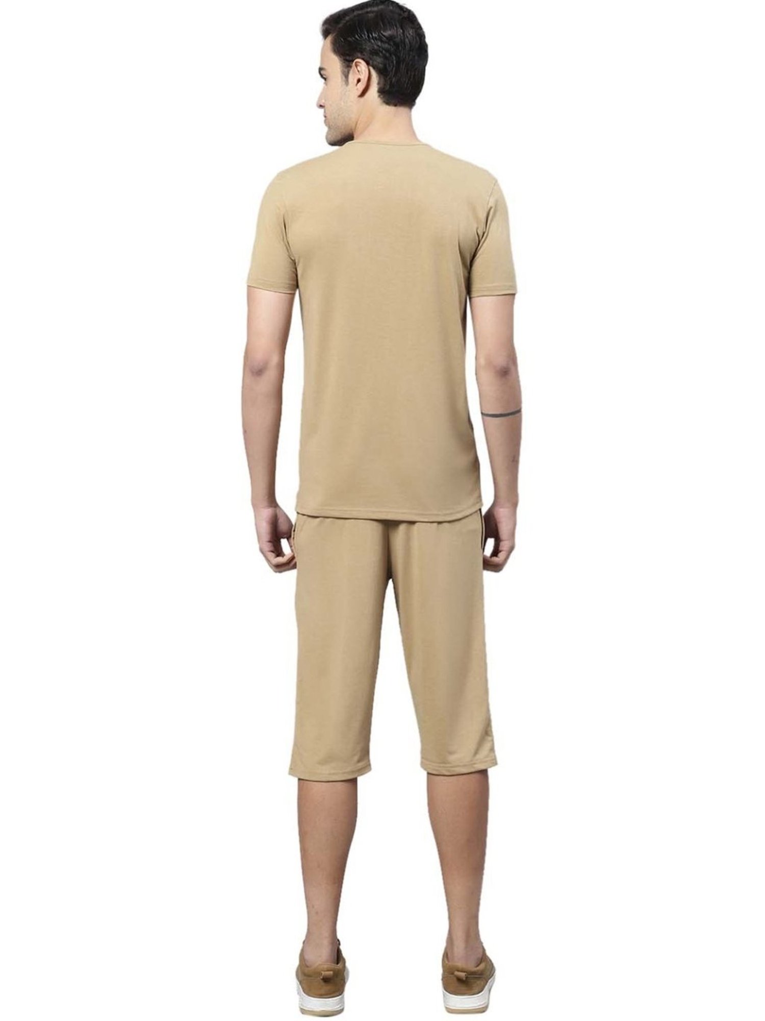 Give your weekend wardrobe a contemporary twist with this light mud regular fit tracksuit from Vimal Jonney. Tailored to sartorial perfection from premium quality fabric, it assures a soft and soothing touch against the skin. The round neck adds to its appeal. Exuding short sleeves, it is sure to fetch you compliments from all.
