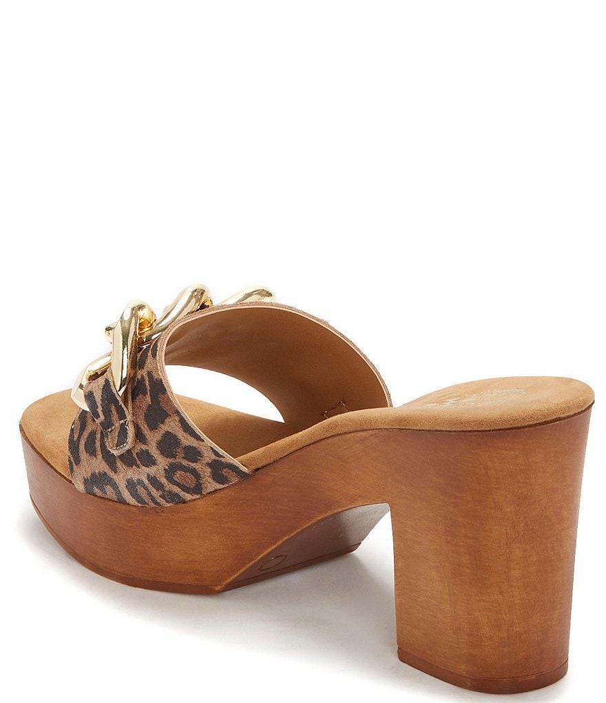 From Vince Camuto, the Leeta Leather Leopard Print Chain Detail Wood Slides feature: