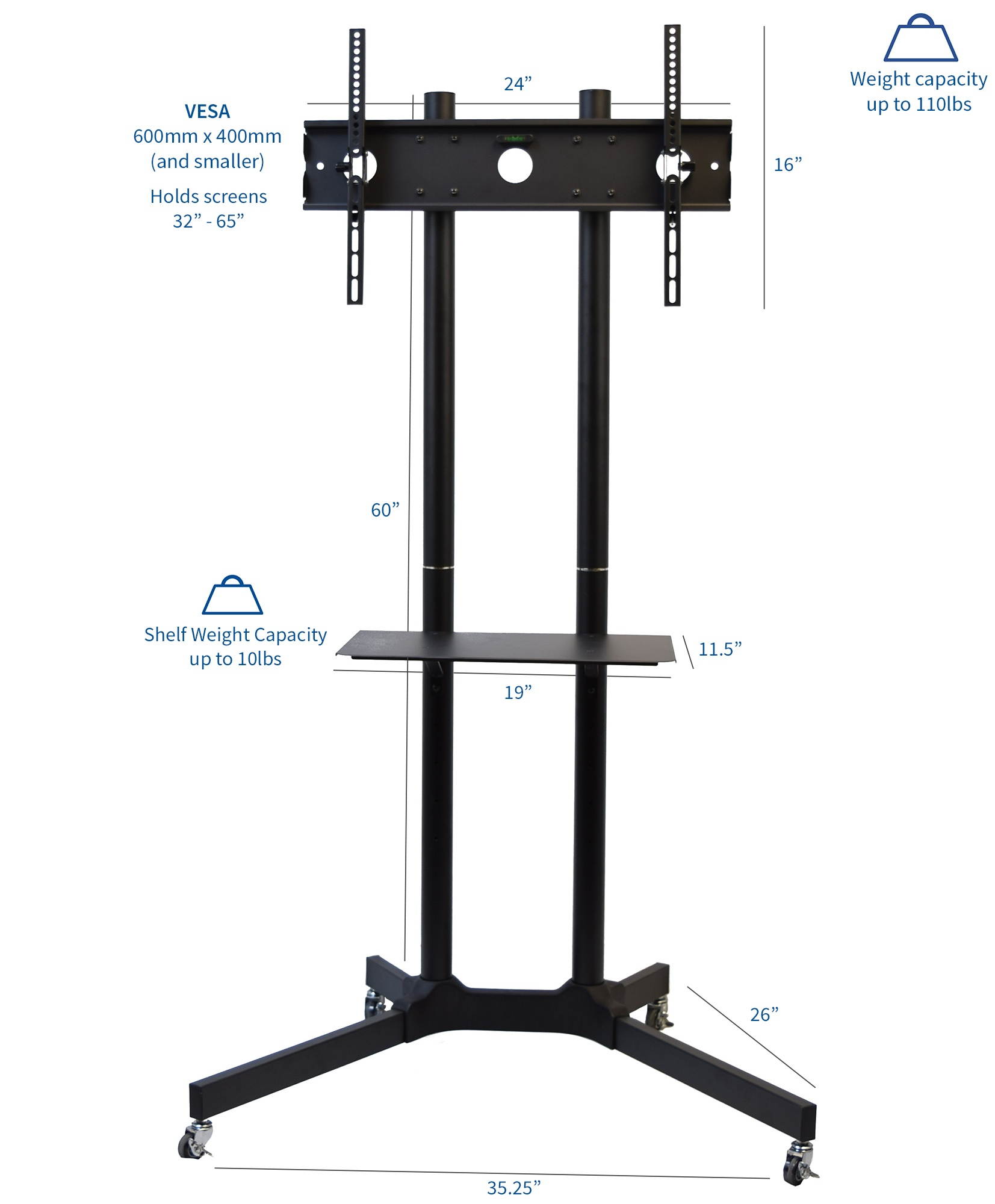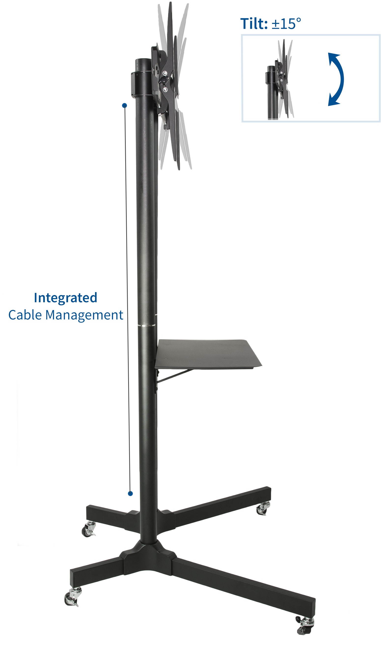 This solid cart features a clean internal cable management system, 4 locking casters on the wheels to make the cart stationary, and an adjustable front metal shelf holding up to 10lbs.