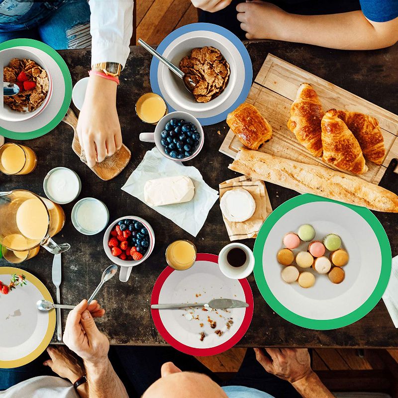 • Each plate, bowl and mug is made of premium lightweight AB-grade porcelain for strength and durability