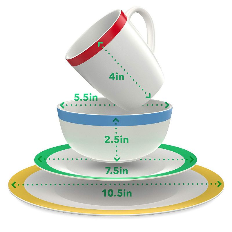 Each plate measures 10.5 inches in diameter, each dessert plate 7.5 inches in diameter, each bowl 5.5 inches in diameter, and each mug is 12 ounces. Best of all, they're stackable to take up less space in your cupboard and dishwasher-safe to make clean-up less of a hassle.