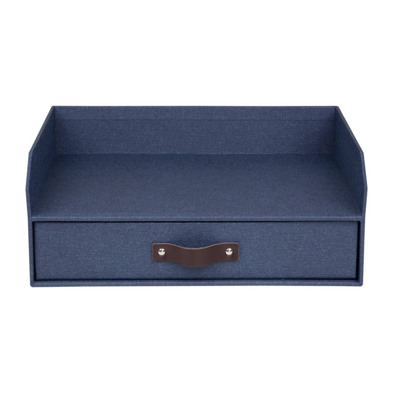 Below the inbox tray is a drawer for storage of letter sized documents or supplies. Includes a distinctive leather pull handle for easy access to the contents within. Coated in a canvas-like blue textured finish over a recycled fiberboard core. Made by hand in Lithuania for Bigso Box of Sweden.