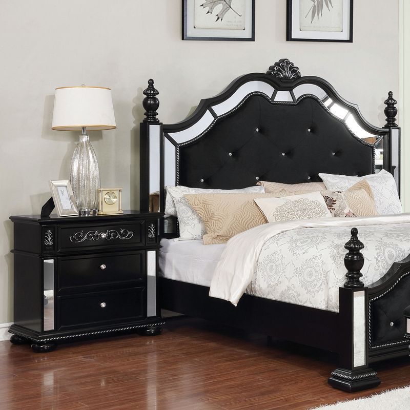 Engage with an exquisite piece fashioned to impress. Lush with glam detailing, this Washington Mirror Trim Three-Drawer Nightstand is a vision of luxury with its captivating mirror panels and carved floral shaped resin overlays. Felt lined top drawers hold delicate fabrics and other fragile and sensitive items. English dovetail construction produces quality drawers. The reflective mirror panels down its sides coordinate with the faux crystal hardware of the drawers, giving off enticing shine and sparkle.