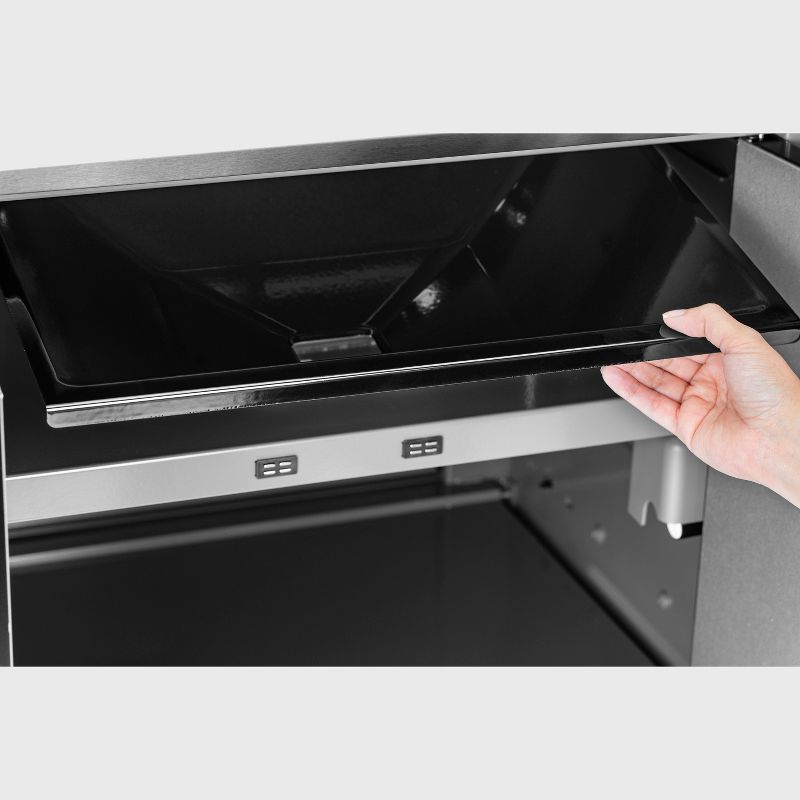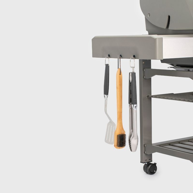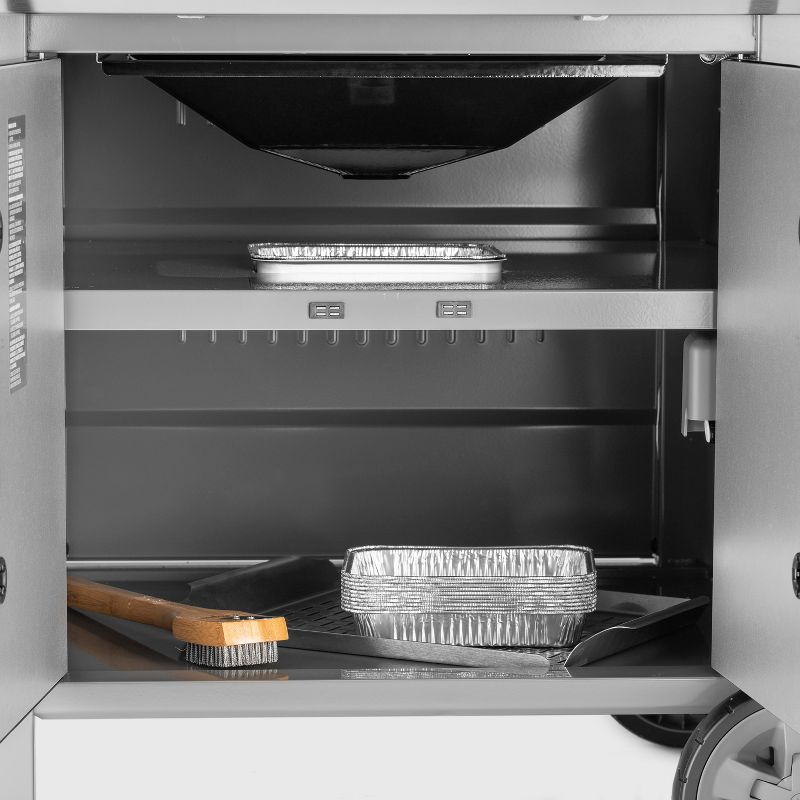 Features: Exterior Temperature Gauges, Control Knob, Assembly Instructions, Storage Cabinet, Handle, electric ignition, Wheels, Locking Casters, Shelves