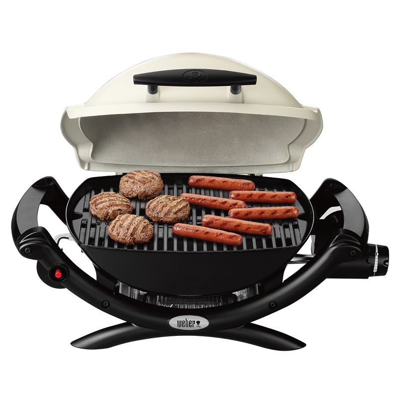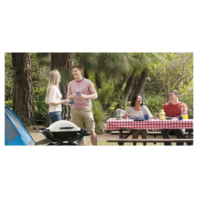 The Weber® Q™ grill legacy is one of great performance and sleek styling. The aesthetics of this Weber® Q™ 1000™ model are both functional and fun and include a larger grip handle and control knobs, ergonomic side handles, sturdy front and rear cradles plus the familiar Weber Q logo branded in the lid. Split grates allow for a grate/griddle cooking combination: Just replace one of the grates with the Weber® Q™ 1000™-series compatible griddle (sold separately) and experience a delicious alternative way of preparing breakfast, lunch and dinner on your grill. Durable, but lightweight, cast-aluminum construction of the Weber® Q™ 1000™ makes this super-portable grill the perfect tailgating companion. Used on the go, it runs on disposable LP cylinders (not included), but can be a stationary a stay-at-home grill also. An optional LP adapter hose for hook up to a 20-lb. tank is available as an accessory. Reliable starts are assured with the simple-to-operate push-button ignition. Burgers, brats and dogs are easily handled, but a large variety of other foods may also be cooked at any temperatures from low to high. Just dial-in the proper heat setting by adjusting the infinite control burner valve. May be used with Weber® Portable Cart model #6557. 5-year limited warranty.