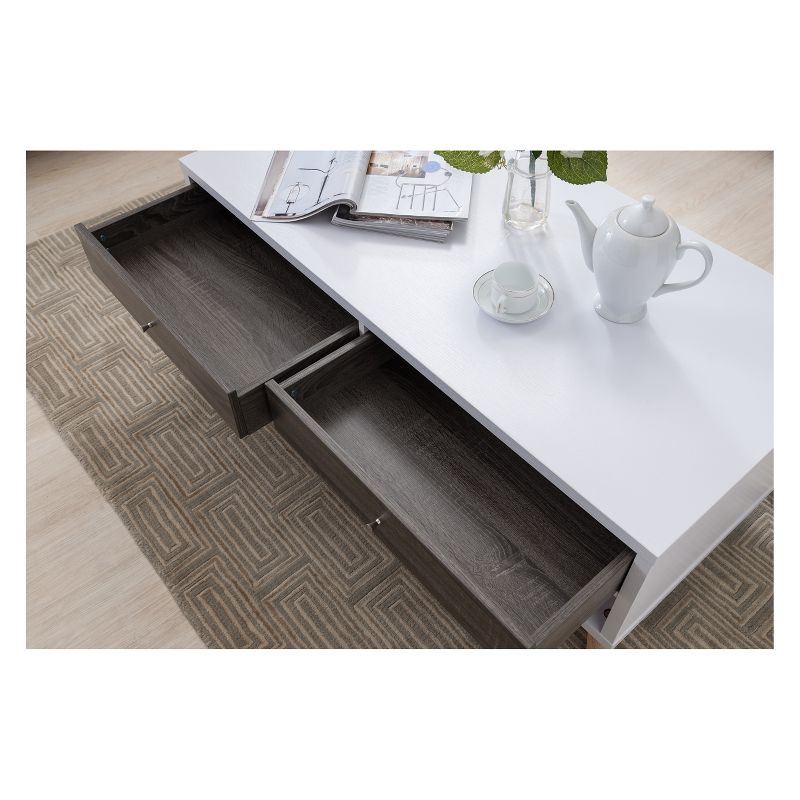 Fill up your living space with the ioHOMES Weller Transitional Two Drawer Coffee Table. With its charming design, it can surely match any living room! The coffee table's white color, wood accented drawers and feet, open shelving, and low profile makes this the perfect accent piece that is stylish and functional. With a variety of storage options, you can rely on this table to hold and store casual items. Add the ioHOMES Weller Transitional Two Drawer Coffee Table as a useful accent furniture piece.