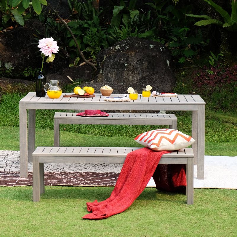 Spruce up your outdoor dining space with the Westlake Wood Patio Dining Set from Cambridge Casual. Seating up to four people comfortably, the three-piece outdoor dining set includes two patio benches and a rectangular dining table. Made with a sturdy mahogany frame, the wooden dining set is weather-resistant for lasting outdoor use and adds a touch of traditional charm to your setting with its paneled construction.