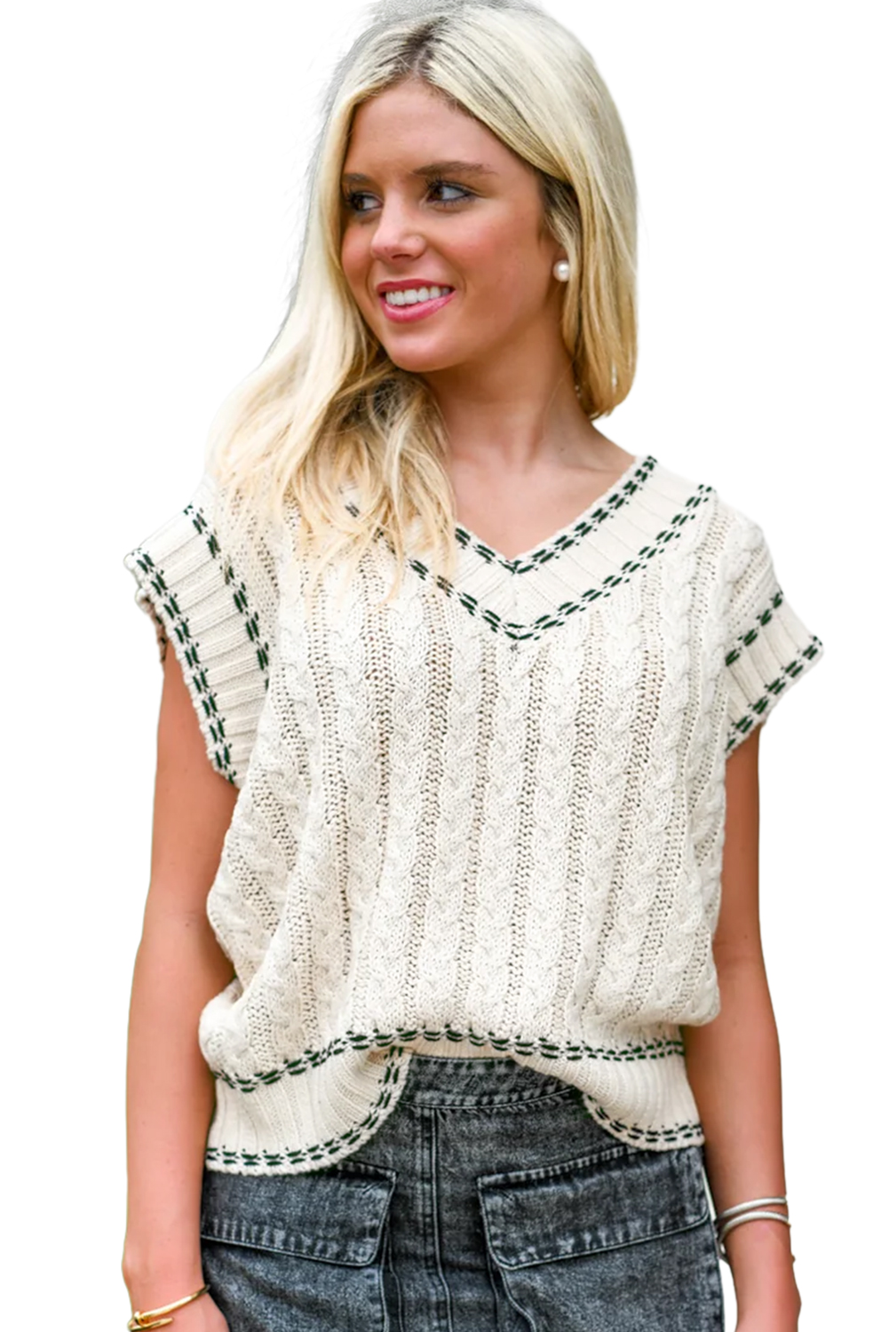 White Contrast Trim V Neck Cable Knit Cap Sleeve Shirt