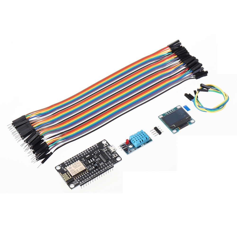 Feature: ESP8266 Wi-Fi Microcontroller for compatible (NodeMCU V2), Pinout: 11 GPIO pins, 1 ADC, 3V3, GND OLED Display (128 x 64) with 4pin I2C connector DHT11 Sensor with 3 pin board Female to Female (40 x 10cm) in rainbow colors USB Cable for powering and programming the development module