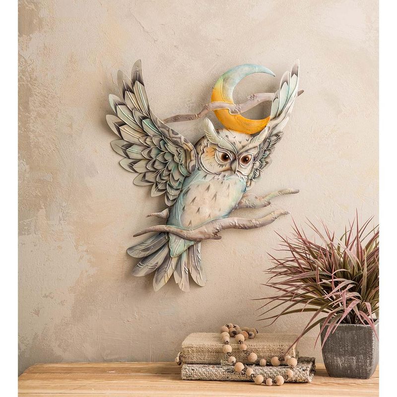 Our Metal and Capiz Owl and Moon Wall Art is beautiful and even a little spooky. This stunning metal wall art captures a majestic owl in flight against a crescent moon and drifting clouds. The colors capture the feel of a scene lit only by moonlight. Natural capiz - the shell of the windowpane oyster - is applied to the surface to add a magical sparkle. For indoor display only. Wind & Weather Exclusive Design.