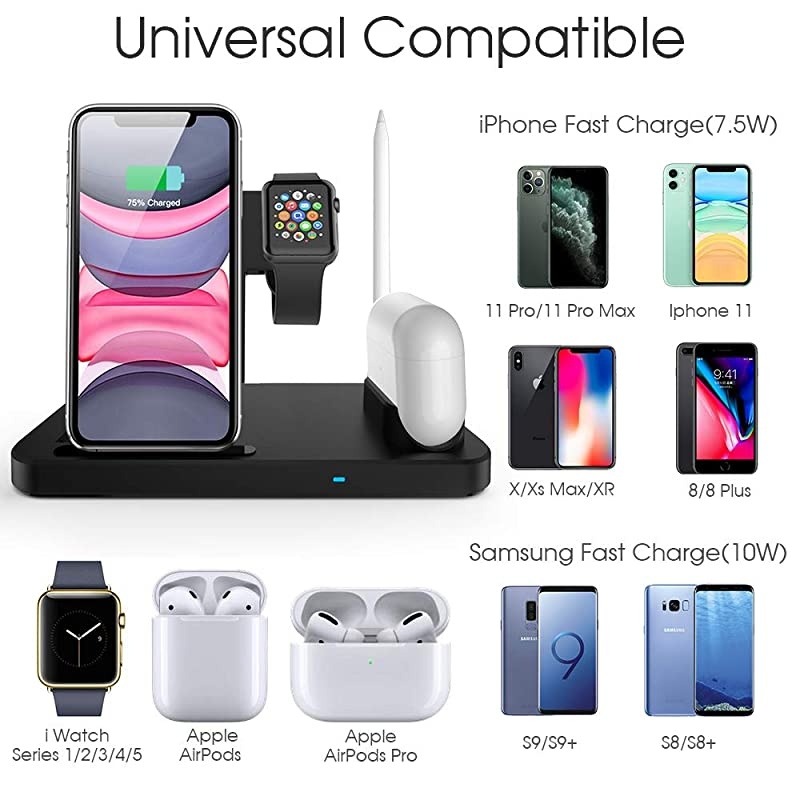 **********Fast Wireless ChargerWireless charger compatible with Qi-Enabled Phones, Apple Watch, AirPods and Apple Pencil can fast charging these devices wirelessly at the same time. High Quality QC 2.0 / 3.0 power adapter (9V/2A) or other 10W support adapter is recommended for fast charging. Using a 5V / 1A adapter may not charge your phone or watch. (Adapter is not included) *****Widely Compatible 7.5W fast charging compatible with iPhone 11/11PRO/11PRO MAX/8/8 plus/XS MAX/XR/XS/X. 10W fast charging compatible with Qi-enabled Android cell phone. 2W fast charging compatible with Apple Watch Series 5/4/3/2/1. Dock charging compatible for Airpods 1/2/Pro and the pencil charging dock compatible with 1st generation Apple Pencil.