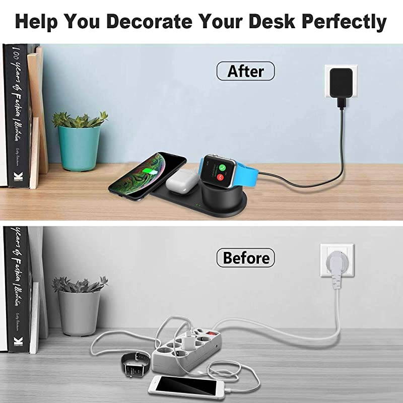 ) *****Compatibility: No need to connect three cables for each device anymore, use our wireless charging stand to charge your iWatch and iPhones and Airpods/Airpods Pro at once! Our charging station for apple products is the best solution to organize your workspace.