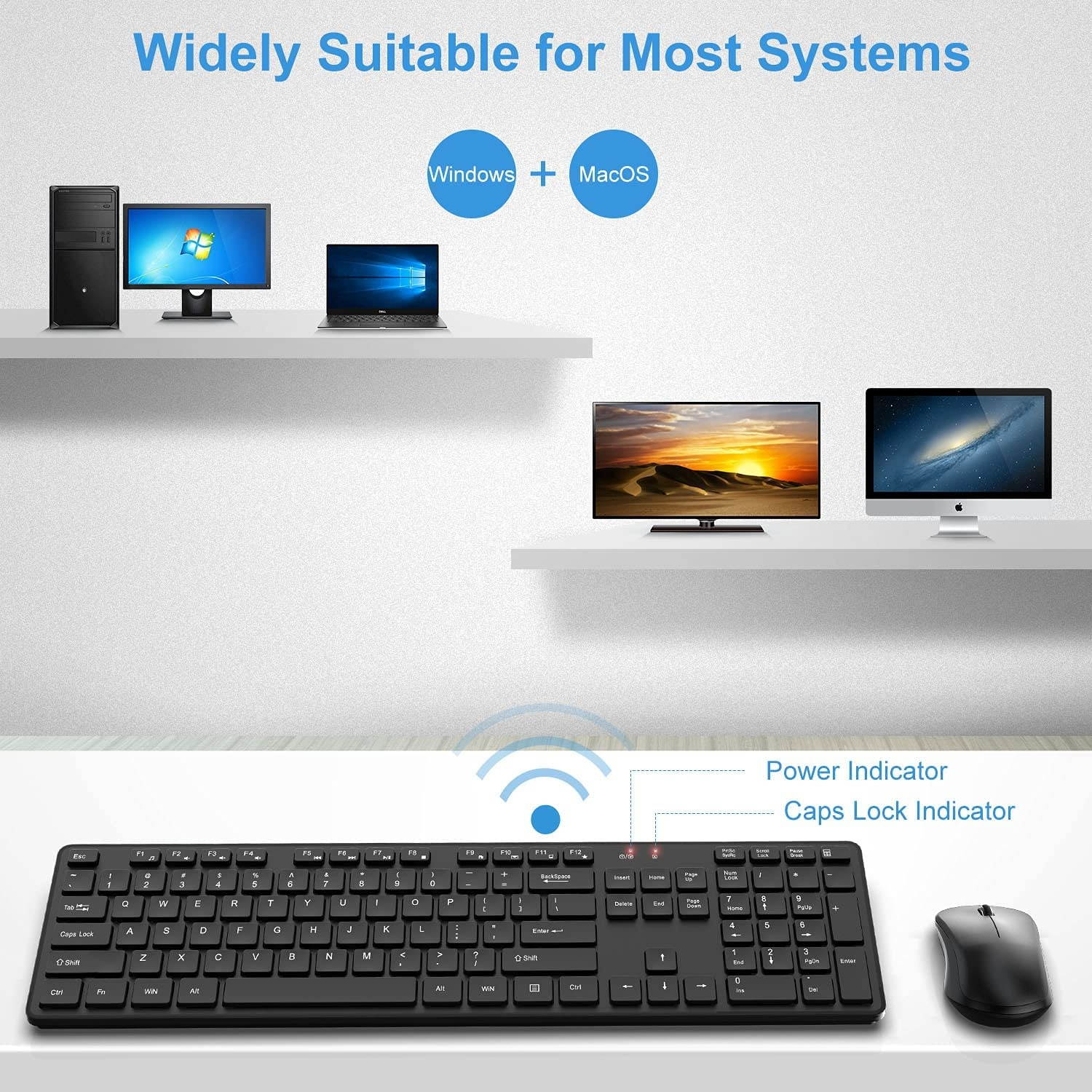 Note: 1) Not fully compatible with Mac OS. 2) The USB receiver is stored in the wireless mouse.? [ 2.4G STABLE CONNECTIVITY] Using advanced 2.4GH z radio-frequency (RF) technology?? the keyboard and mouse combo offer a stable wireless connection for up to 33 feet and?? nearly no typing or clicking lag. They connect your computer with a USB unifying receiver?? and work right away?? without needing to install any complicated software additions. Real Plug-and-Play!? [SUPER ERGONOMIC COMFORT] Want a more pleasurable computing experience? Choose ergonomic keyboard and mouse. Built with soft crater-switch keys?? our low-profile keyboard is amazingly quiet?? responsive and comfortable to touch?? while keeping dimensions slim for a sleek?? minimalist look to fit with home or office. Together with a nicely contoured silent mouse.? [EASY-ACCESS SHORTCUT KEYS] The computer keyboard brings high productivity to you with additional hot keys?? so you can have quick media control for volume?? play/pause?? music?? movies?? e-mail?? calculator and more?? without disrupting what you are doing on the screen. Also?? high 1200 DPI of this wireless mouse allows it to work on just about any surface accurately.? [COMPATIBILITY AND WARRANTY] Compatible with almost all popular operating systems including Windows 2000/ ME/ XP/ Vista/ 7/ 8/ 10 and more.