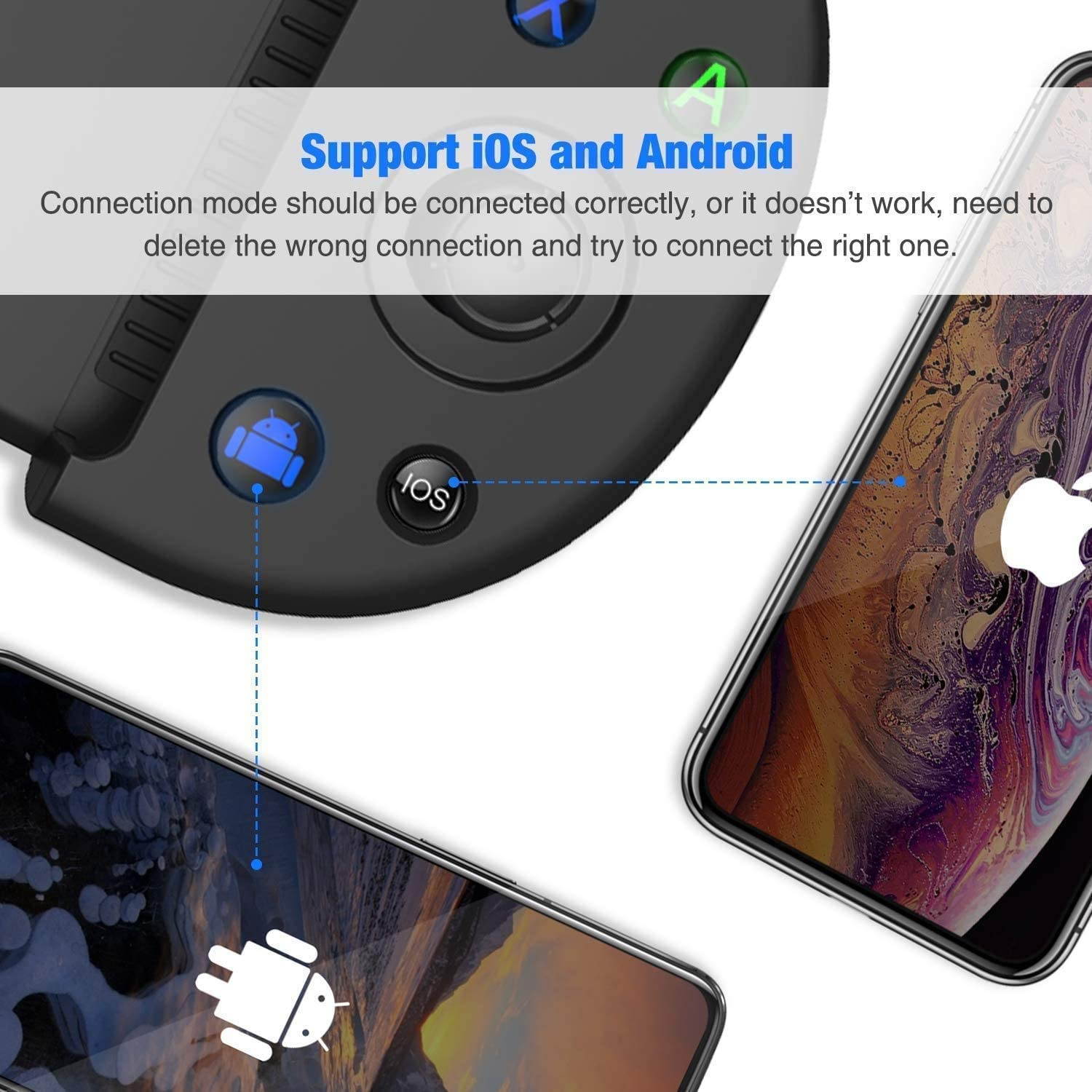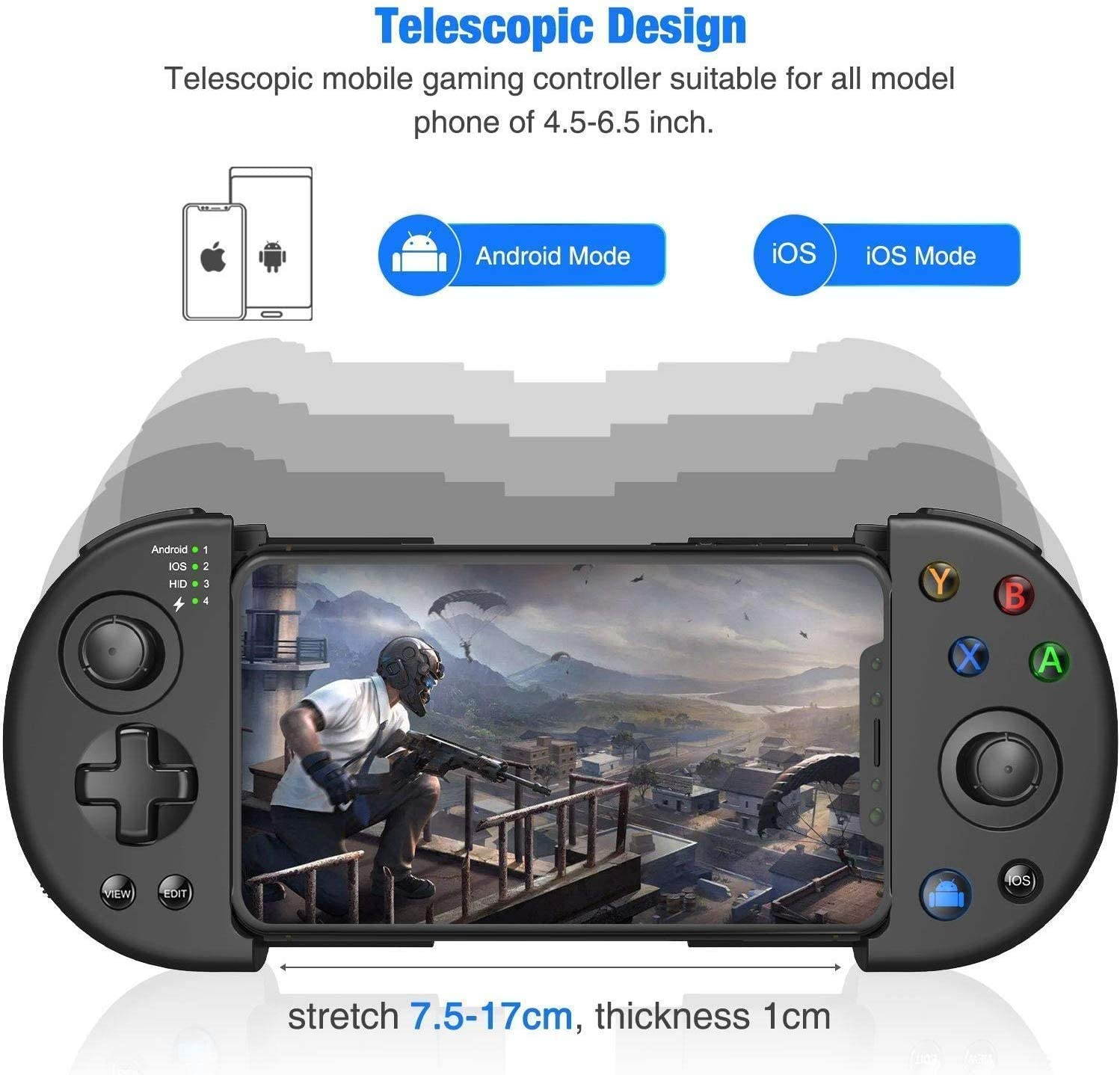 Wireless Game Controller - Easy to connect through bluetooth, no wired needed, foldable clip for your phone, pocket-size, easy to carry anywhere you want. High percision and easy to press and immediate response, move effortlessly in any direction. Stretchable Grip - Telescopic mobile gaming controller suitable for phones of 3.5-6.5inch, it extends your phone into a traditional controller, more comfortable for your hands, never get hands cramps after long time play; works for Sumsung galaxy / LG/ HTC/ Sony/ Nokia/ Motorola/ Huawei/ Xiaomi/ HTC/ nova/iPhone XR/ iPhone X/ iPhone XS/ iPhone 8. Not support MTK device. Mobile Gamepad for Android and iOS iPhone - Support Android 4.0, iOS 11.0~13.3 and for Windows operate sysytem and so on. Built-in wireless Bluetooth, can support 2~10 meters wide range of control from the operation. 3 Modes Android/IOS/HID meet all your needs; With Bluetooth technology, new way to play your favorite FPS games such as PUBG, Arena of Valor, |