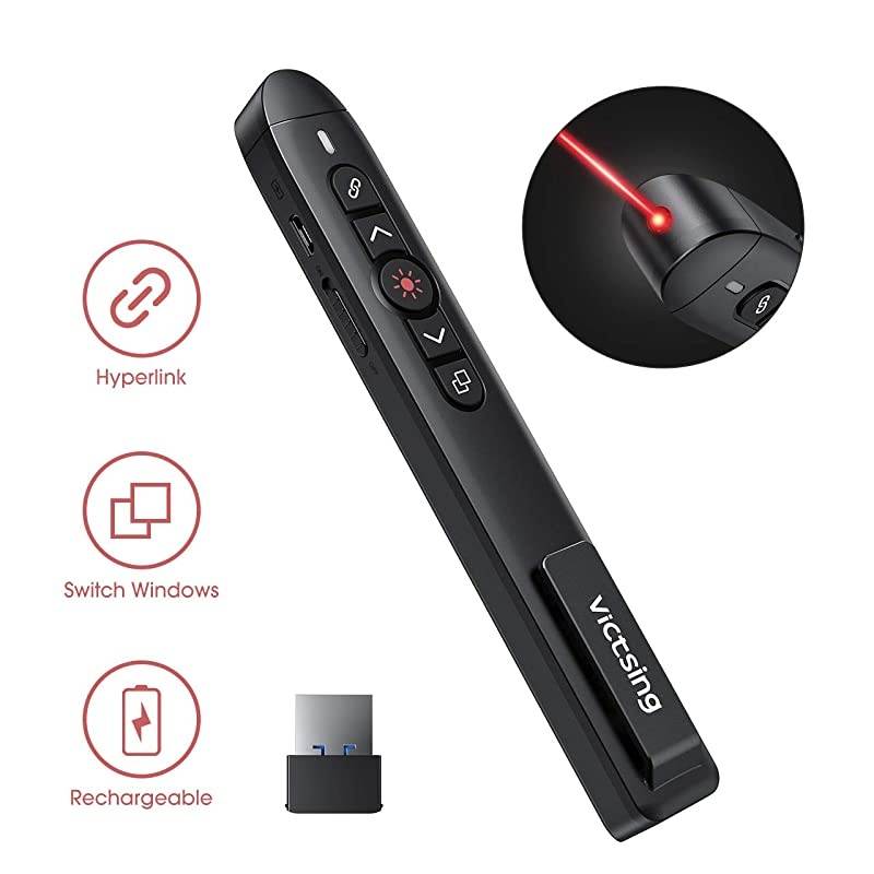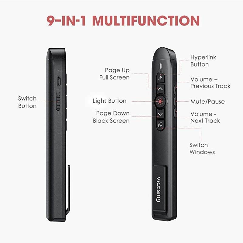 ***** **********Best Quality Guranteed. *****9-in-1 Multifunction. Equipped with 9 buttons including hyperlink, switch pane, volume control, full screen, black screen, mute and more, wireless presenter enables you to open hyperlink and switch panes quickly and smoothly. Bright red light lets you navigate through your report easily. *****Quick Recharge & Long Working Time. Built-in 300mAh rechargeable lithium battery, 2.4G hz remote control works up to wireless range: 100ft, red