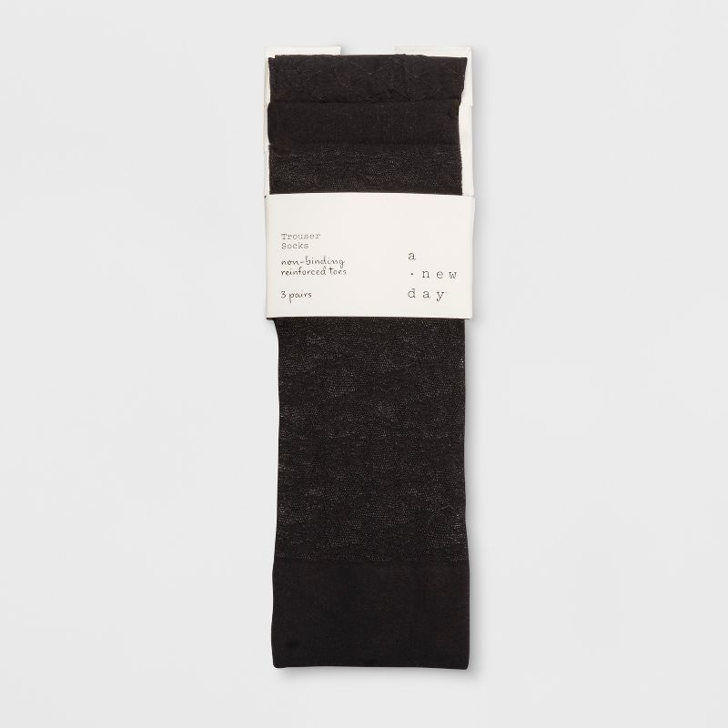 Whether you're in a blouse, trousers and pair of pumps, or cropped skinnies and an oversized sweatshirt, the Mesh Floral and Opaque Trouser Socks from A New Dayâ„¢ are a stylish way to complete any look. Knit from a super-soft nylon-blend fabric with added spandex, these black trouser socks provide breathable comfort for all-day wear. They feature banded cuffs for a snug fit, along with non-binding reinforced toes for long-lasting wear that further contributes to the comfortable design. Plus, you'll love having one solid black pair for an understated look, and then reaching for one of the two mesh pairs for a touch of extra flair.