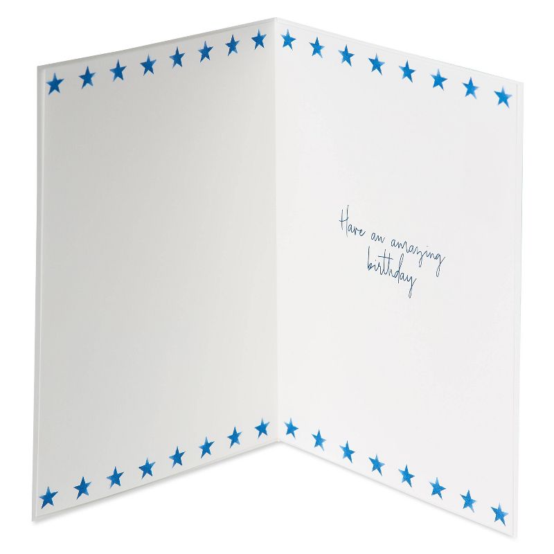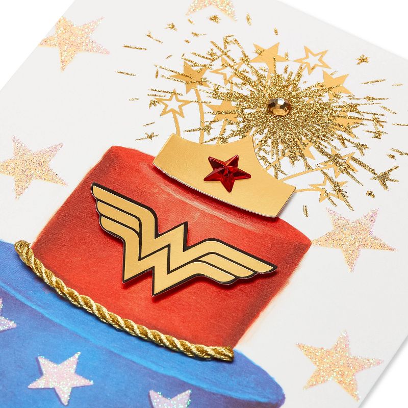 Celebrate a wonder-ful woman with an exquisite birthday card from Papyrus! This bright and beaming card reflects Wonder Woman’s signature style, with a patriotic color story, plenty of sparkling gold glitter and metallic foil. Dimensional cake embellishments include gold, lasso-like piping, a WW emblem and a tiara topper. Gold and red star gems add power decorations. She’ll be wowed as soon as she receives the card in its shimmering gold envelope lined with a pattern of white stars on blue. With amazing details and upscale materials, beautiful birthday cards by Papyrus offer premium looks for extraordinary women!