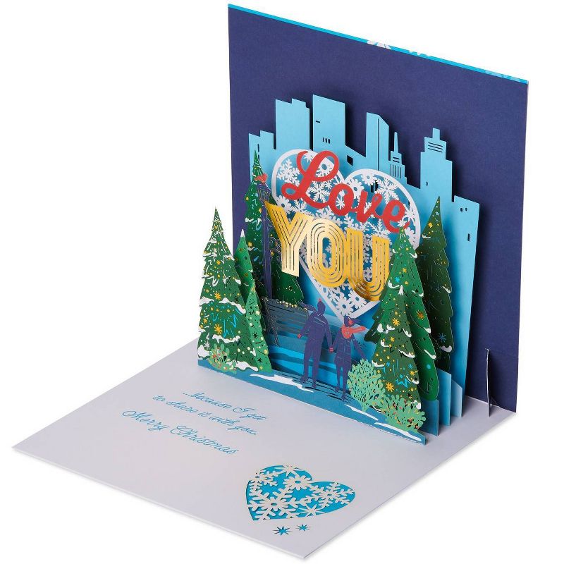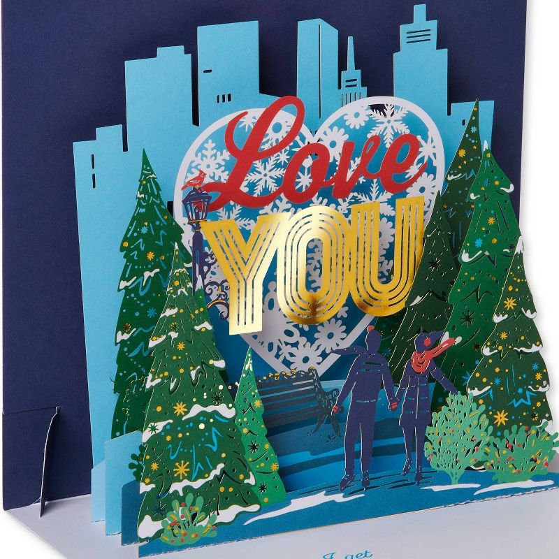Share a heartfelt Christmas surprise! This pop-up Christmas card features intricate, laser-cut shapes folded and paper-engineered to stand up in an extraordinary, 3D cityscape with skyscrapers, holiday trees and an ice-skating couple below a big heart and a ‘Love You’ message. Shimmering gold foil accents add a sophisticated touch. Displayable Christmas cards are the perfect choice for extra-special recipients!