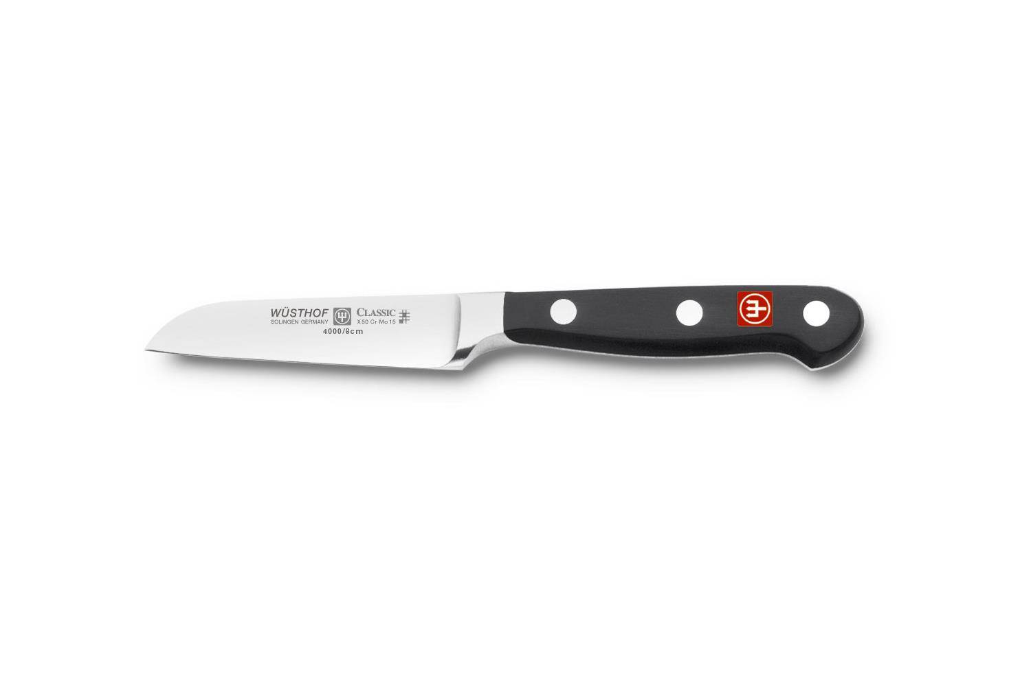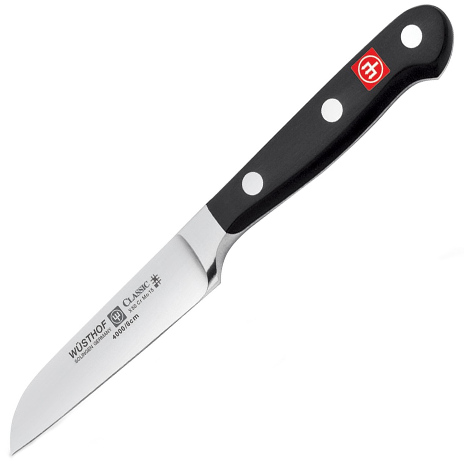 A flat-bladed paring knife for preparing small fruits and vegetables. The precision forged blade, bolster, and tang are married to the incredibly durable Hostaform-C handle, triple-riveted to the fully-visible tang.