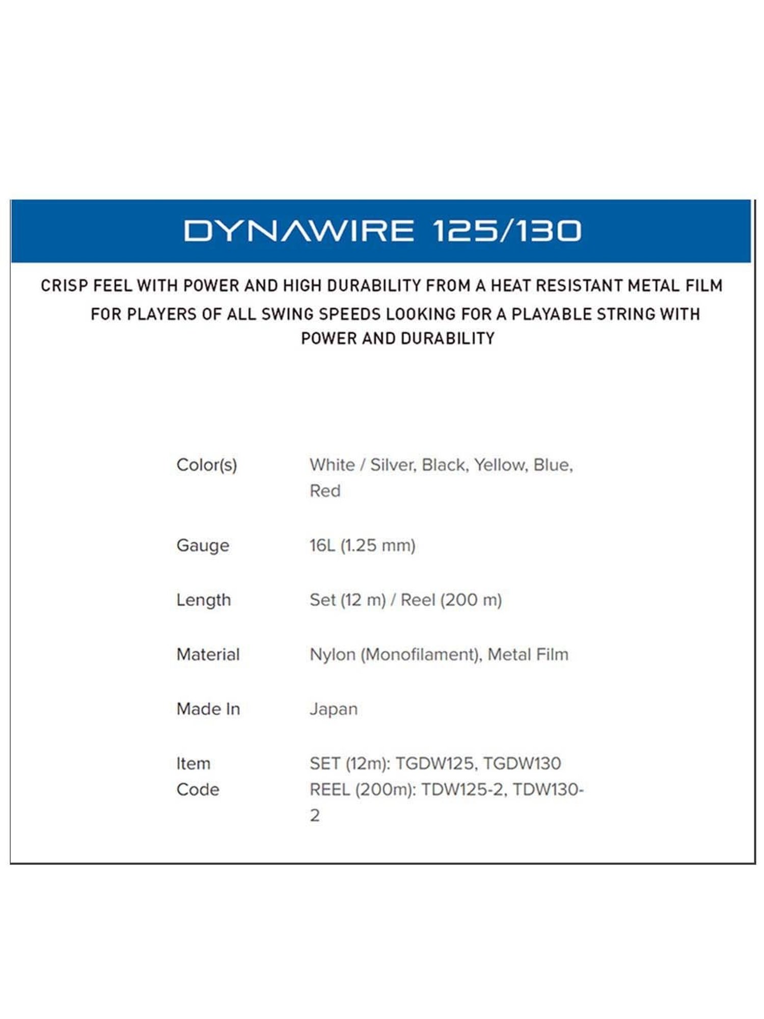 Unleash the tension and conquer the court with these white tennis strings from Yonex. These strings have a length of 200 m and are made using nylon (monofilament) and metal film. They have a gauge size of 16L (1.25 mm) and come packed in a reel. It is ideal for players of all swing speeds looking for a playable string with power and durability.