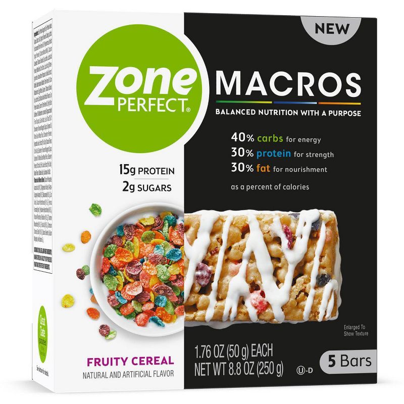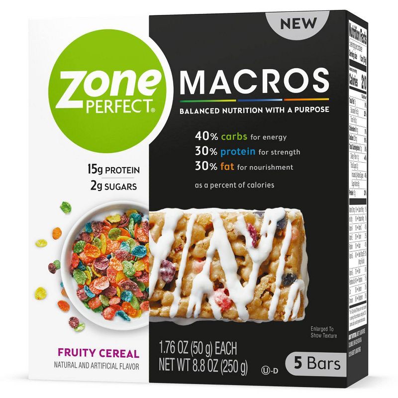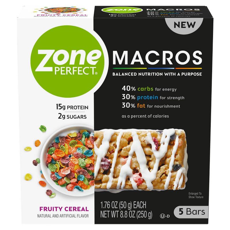 ZonePerfect Macros bars have a balanced blend of macronutrients—40% carbs for energy, 30% protein for strength, and 30% fat for nourishment (as a percent of calories). That’s a proven macros ratio for total body wellness.†With 15g of high-quality protein and 1-2g sugars, these bars are a smart on-the-go snack. If you’re not 100% satisfied with the taste, we’ll give you your money back, guaranteed!