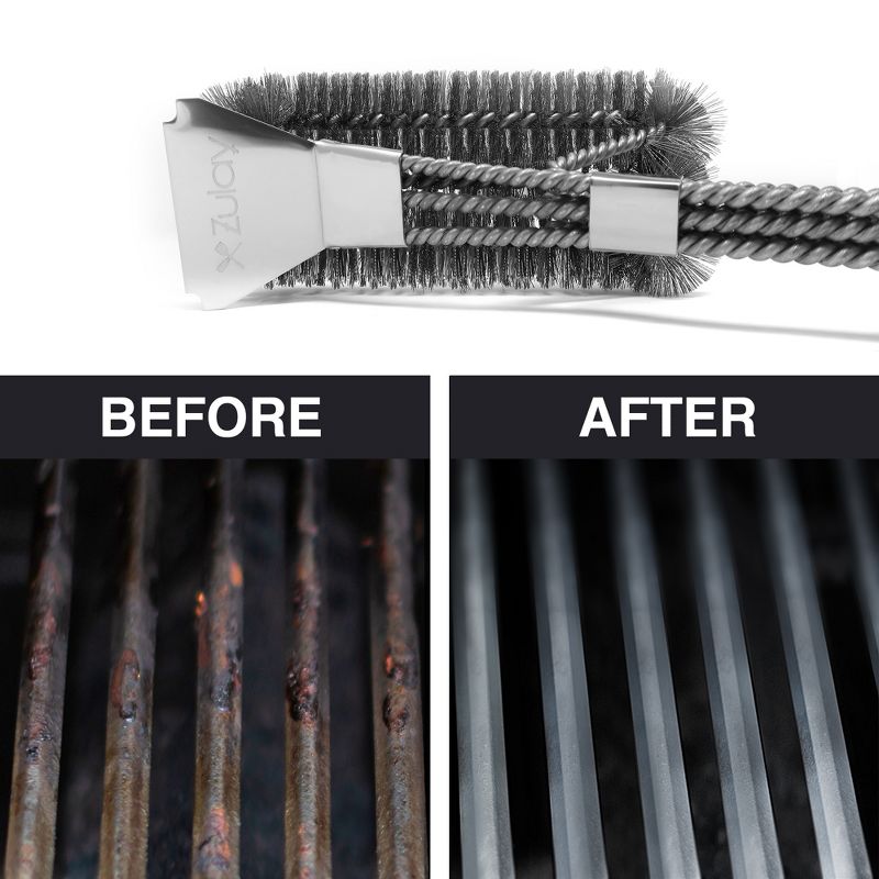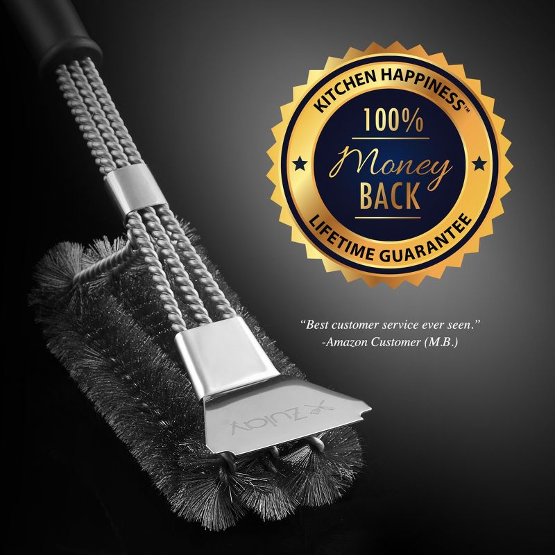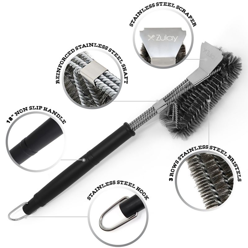 A tough brush that works! This heavy-duty Brush Cleaner is the Real McCoy! It does its job well and has a long handle that keeps your hands away from the heat. Packed with three rows of tightly bound stainless steel bristles, angled to get deep in the grooves and clean between grates. Built-in stainless steel Grill Scraper and 18" long handle will effectively remove cooked-on gunk. A bonus is it has a Reinforced Stainless Steel Shaft, Stainless Steel Scrapper, and Stainless Steel Hook that covers three times the surface and will leave your grill clean and ready for the next round of delicious BBQ. 100% Rust Proof. Remember, a clean grill is equal to a Healthy BBQ!